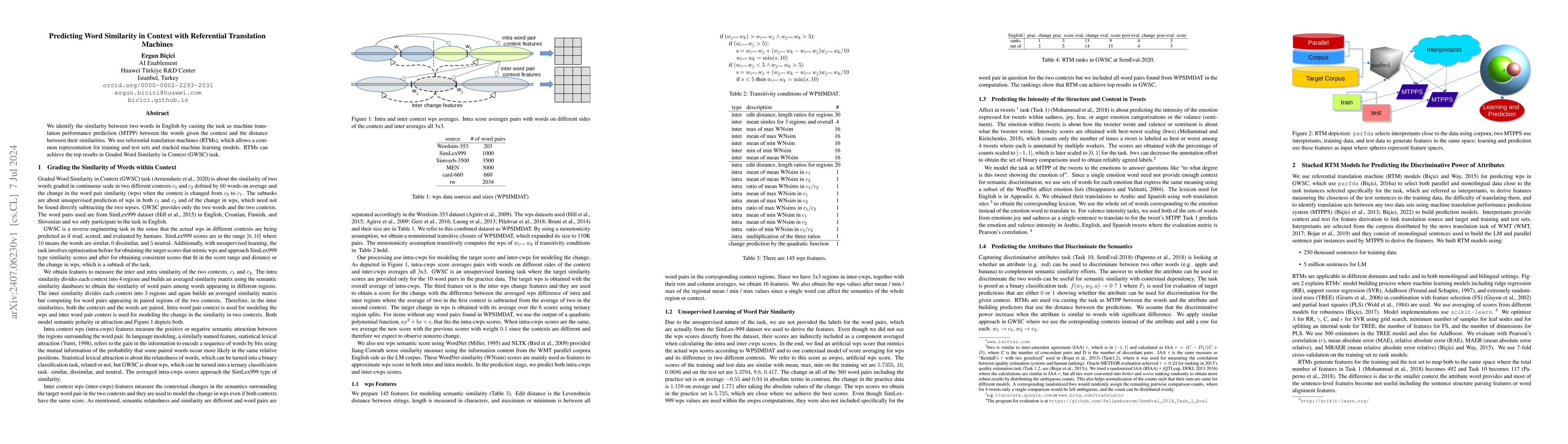 We identify the similarity between two words in English by casting the task as machine translation performance prediction (MTPP) between the words given the context and the distance between their similarities. We use referential translation machines (RTMs), which allows a common representation for training and test sets and stacked machine learning models. RTMs can achieve the top results in Graded Word Similarity in Context (GWSC) task.