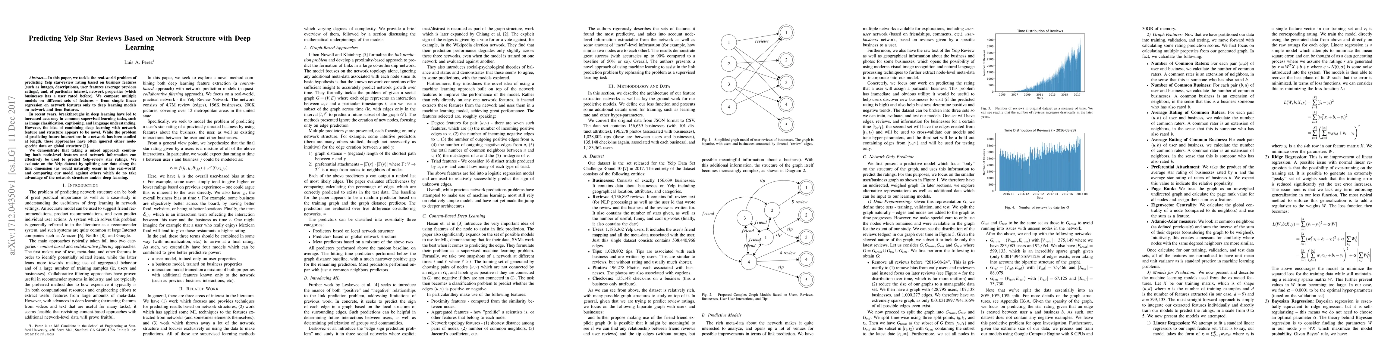 This paper explores predicting Yelp star-review ratings using deep learning models that incorporate both business and user features, along with network properties. The study finds that combining node-specific data and network structure significantly improves prediction accuracy compared to models that ignore these aspects.