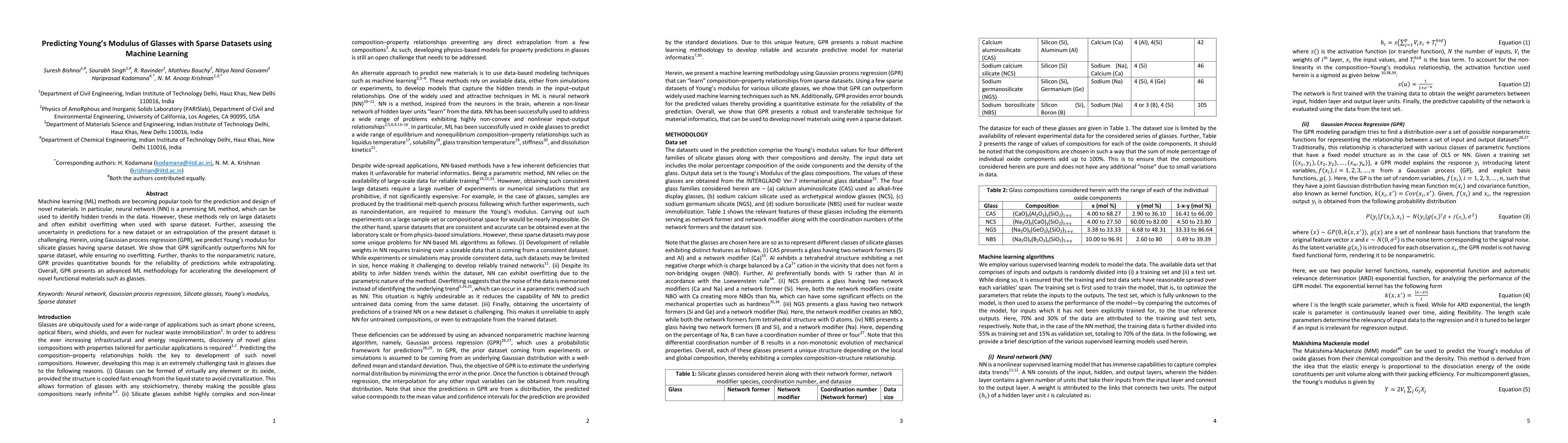 This paper explores the use of Gaussian process regression (GPR) to predict Young's modulus in silicate glasses with sparse datasets, demonstrating its superior performance over neural networks (NN) and its ability to provide reliable uncertainty bounds for predictions.