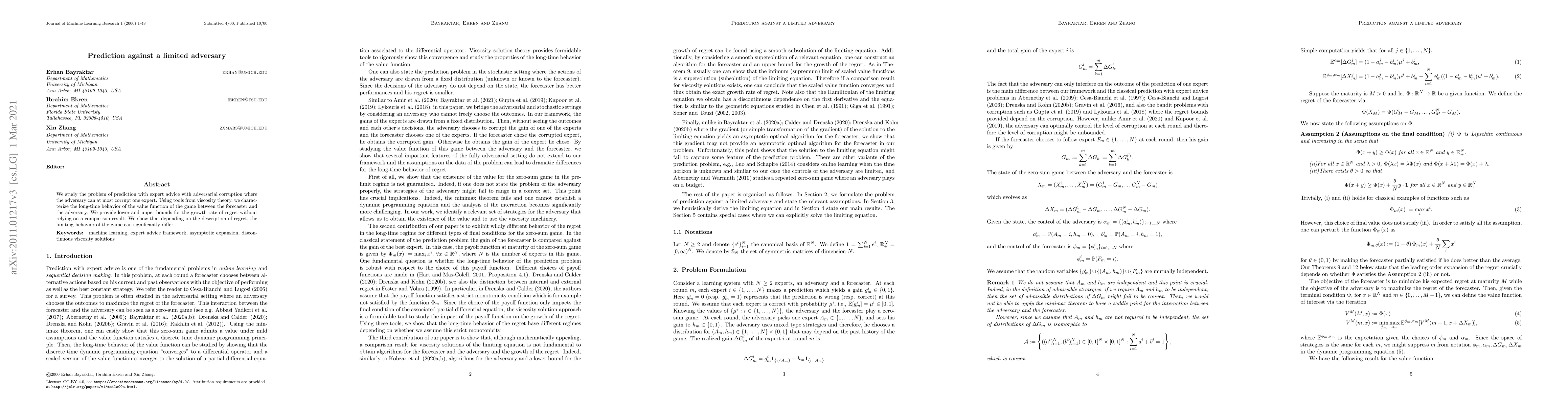 This research paper studies prediction problems with adversarial corruption, limiting the adversary's interference to just one expert. Utilizing viscosity theory, it characterizes the long-term behavior of the forecasting game's value function. The paper presents lower and upper bounds for regret growth rates without comparison results, revealing that the regret's description can significantly impact the game's long-term behavior.
