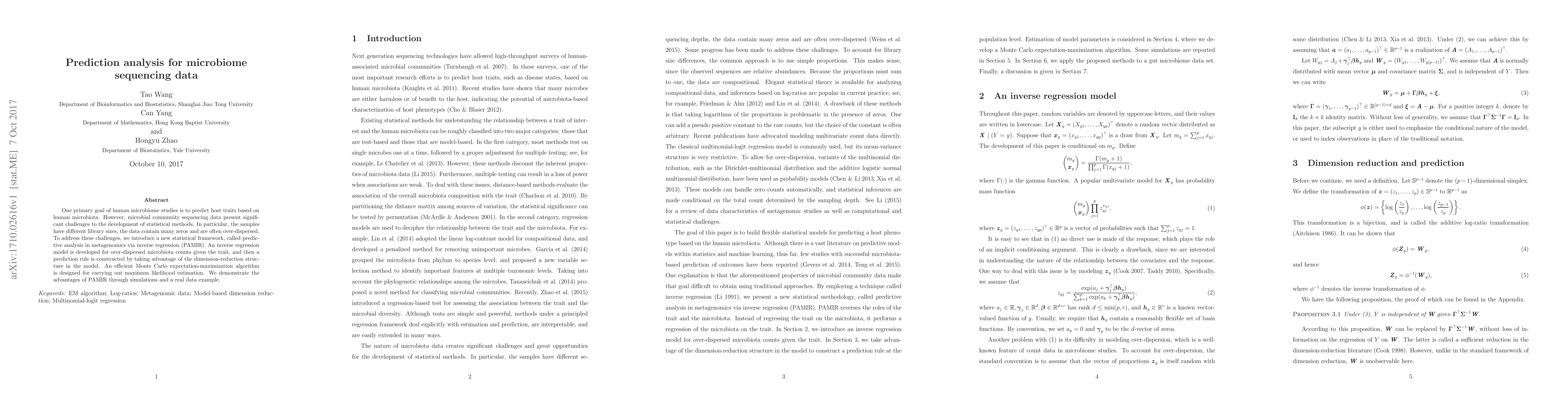 One primary goal of human microbiome studies is to predict host traits based on human microbiota. However, microbial community sequencing data present significant challenges to the development of statistical methods. In particular, the samples have different library sizes, the data contain many zeros and are often over-dispersed. To address these challenges, we introduce a new statistical framework, called predictive analysis in metagenomics via inverse regression (PAMIR). An inverse regression model is developed for over-dispersed microbiota counts given the trait, and then a prediction rule is constructed by taking advantage of the dimension-reduction structure in the model. An efficient Monte Carlo expectation-maximization algorithm is designed for carrying out maximum likelihood estimation. We demonstrate the advantages of PAMIR through simulations and a real data example.