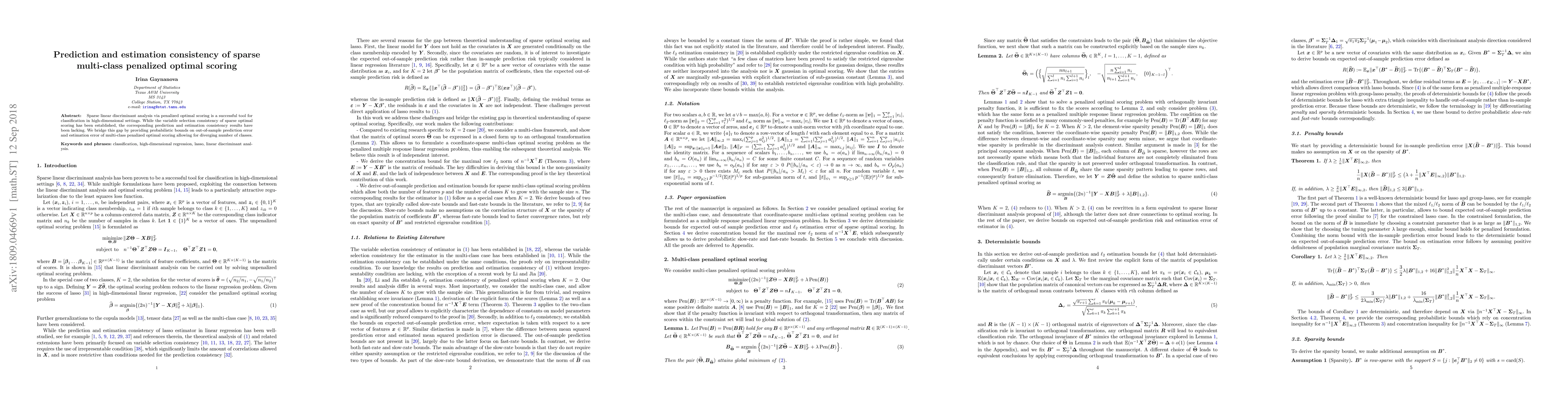 This paper establishes prediction and estimation consistency for sparse multi-class penalized optimal scoring, providing probabilistic bounds on out-of-sample prediction and estimation errors in high-dimensional settings, even as the number of classes diverges.