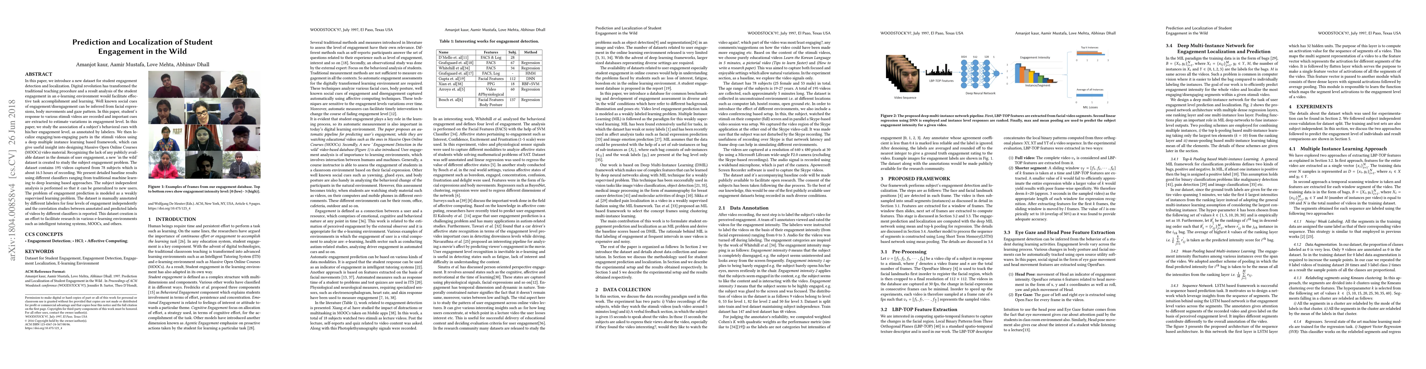 This paper introduces a new "in the wild" dataset for detecting and localizing student engagement through facial expressions, body movements, and gaze patterns in e-learning environments. The study uses a deep multiple instance learning framework to analyze student responses to video stimuli, aiming to enhance the design of Massive Open Online Courses (MOOCs).