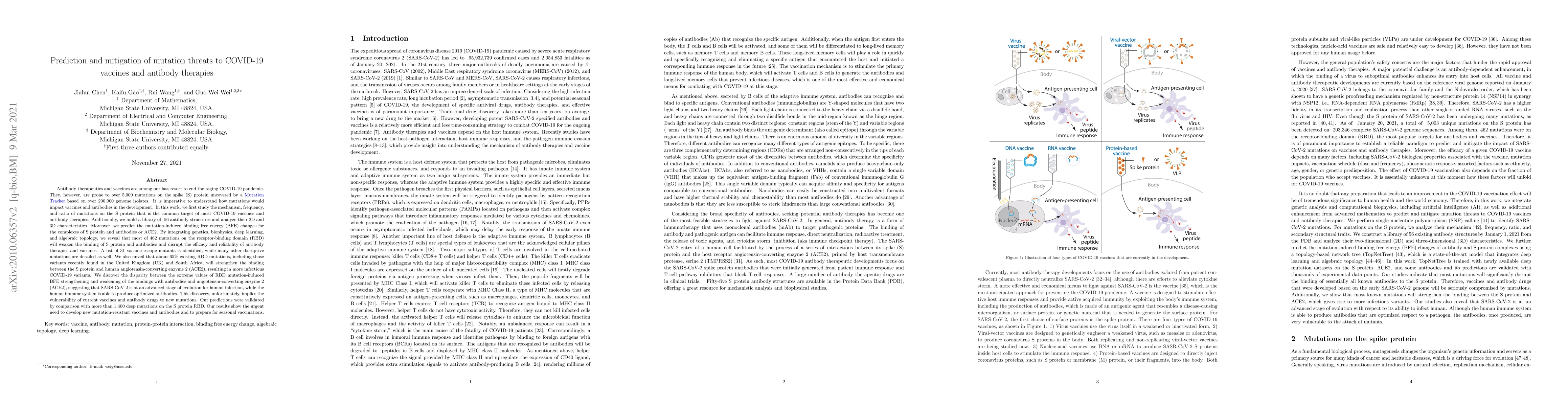 Antibody therapeutics and vaccines are among our last resort to end the raging COVID-19 pandemic. They, however, are prone to over 5,000 mutations on the spike (S) protein uncovered by a Mutation Tracker based on over 200,000 genome isolates. It is imperative to understand how mutations would impact vaccines and antibodies in the development. In this work, we study the mechanism, frequency, and ratio of mutations on the S protein. Additionally, we use 56 antibody structures and analyze their 2D and 3D characteristics. Moreover, we predict the mutation-induced binding free energy (BFE) changes for the complexes of S protein and antibodies or ACE2. By integrating genetics, biophysics, deep learning, and algebraic topology, we reveal that most of 462 mutations on the receptor-binding domain (RBD) will weaken the binding of S protein and antibodies and disrupt the efficacy and reliability of antibody therapies and vaccines. A list of 31 vaccine escape mutants is identified, while many other disruptive mutations are detailed as well. We also unveil that about 65\% existing RBD mutations, including those variants recently found in the United Kingdom (UK) and South Africa, are binding-strengthen mutations, resulting in more infectious COVID-19 variants. We discover the disparity between the extreme values of RBD mutation-induced BFE strengthening and weakening of the bindings with antibodies and ACE2, suggesting that SARS-CoV-2 is at an advanced stage of evolution for human infection, while the human immune system is able to produce optimized antibodies. This discovery implies the vulnerability of current vaccines and antibody drugs to new mutations. Our predictions were validated by comparison with more than 1,400 deep mutations on the S protein RBD. Our results show the urgent need to develop new mutation-resistant vaccines and antibodies and to prepare for seasonal vaccinations.