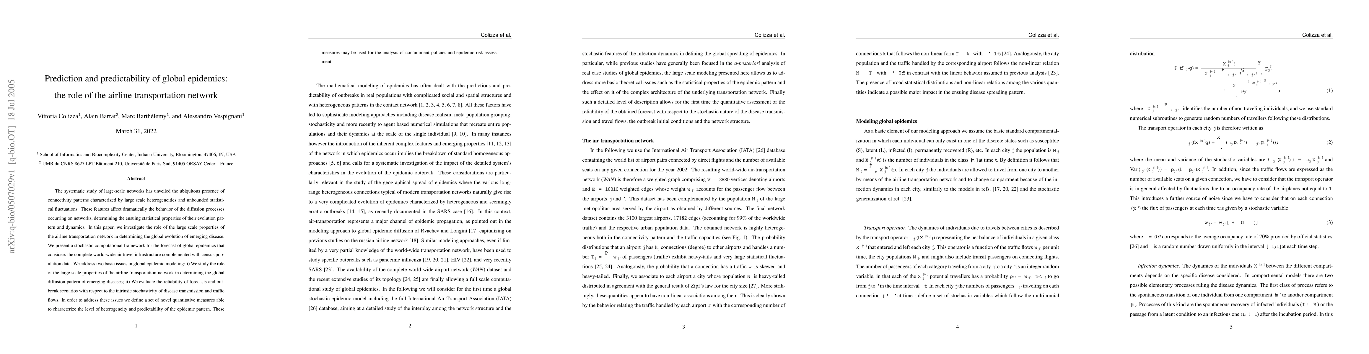 The systematic study of large-scale networks has unveiled the ubiquitous presence of connectivity patterns characterized by large scale heterogeneities and unbounded statistical fluctuations. These features affect dramatically the behavior of the diffusion processes occurring on networks, determining the ensuing statistical properties of their evolution pattern and dynamics. In this paper, we investigate the role of the large scale properties of the airline transportation network in determining the global evolution of emerging disease. We present a stochastic computational framework for the forecast of global epidemics that considers the complete world-wide air travel infrastructure complemented with census population data. We address two basic issues in global epidemic modeling: i) We study the role of the large scale properties of the airline transportation network in determining the global diffusion pattern of emerging diseases; ii) We evaluate the reliability of forecasts and outbreak scenarios with respect to the intrinsic stochasticity of disease transmission and traffic flows. In order to address these issues we define a set of novel quantitative measures able to characterize the level of heterogeneity and predictability of the epidemic pattern. These measures may be used for the analysis of containment policies and epidemic risk assessment.