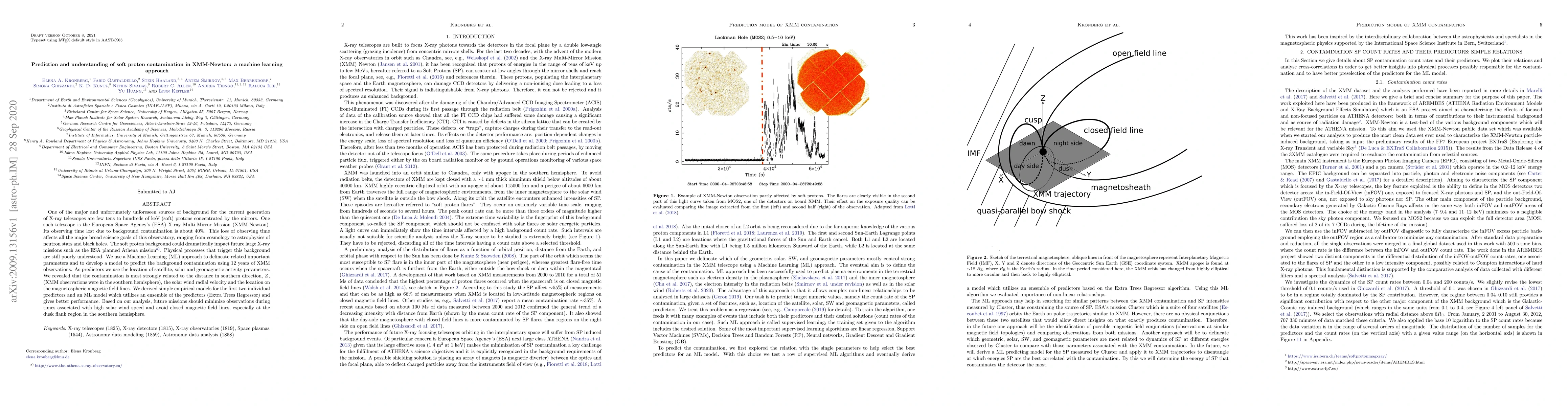 One of the major and unfortunately unforeseen sources of background for the current generation of X-ray telescopes are few tens to hundreds of keV (soft) protons concentrated by the mirrors. One such telescope is the European Space Agency's (ESA) X-ray Multi-Mirror Mission (XMM-Newton). Its observing time lost due to background contamination is about 40\%. This loss of observing time affects all the major broad science goals of this observatory, ranging from cosmology to astrophysics of neutron stars and black holes. The soft proton background could dramatically impact future large X-ray missions such as the ESA planned Athena mission (http://www.the-athena-x-ray-observatory.eu/). Physical processes that trigger this background are still poorly understood. We use a Machine Learning (ML) approach to delineate related important parameters and to develop a model to predict the background contamination using 12 years of XMM observations. As predictors we use the location of satellite, solar and geomagnetic activity parameters. We revealed that the contamination is most strongly related to the distance in southern direction, $Z$, (XMM observations were in the southern hemisphere), the solar wind radial velocity and the location on the magnetospheric magnetic field lines. We derived simple empirical models for the first two individual predictors and an ML model which utilizes an ensemble of the predictors (Extra Trees Regressor) and gives better performance. Based on our analysis, future missions should minimize observations during times associated with high solar wind speed and avoid closed magnetic field lines, especially at the dusk flank region in the southern hemisphere.