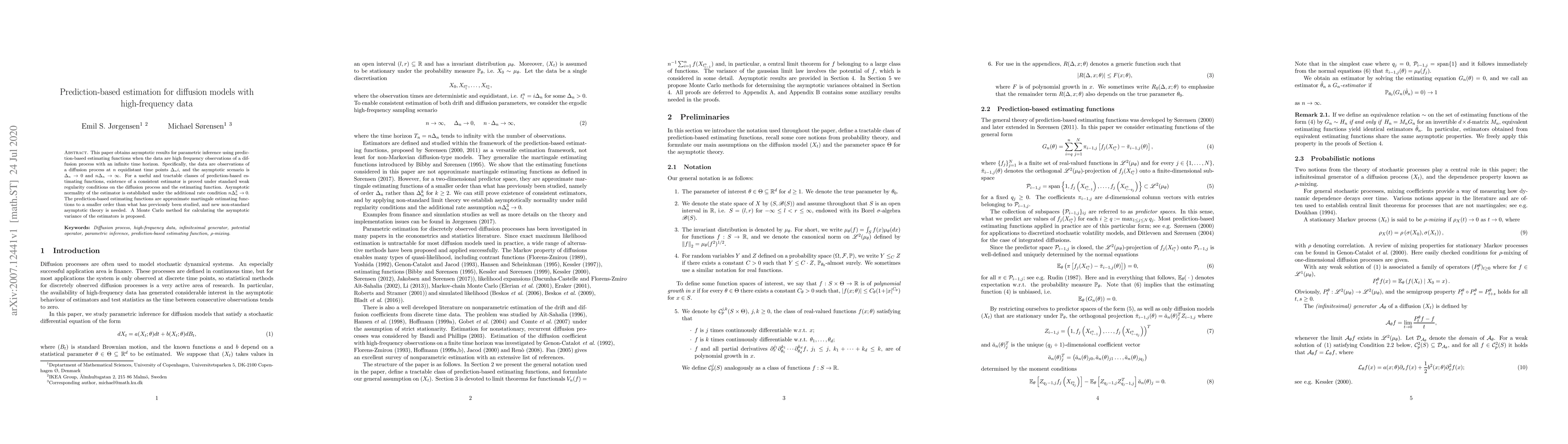 This paper establishes asymptotic results for estimating parameters in diffusion models with high-frequency data, showing that consistent estimators exist under certain conditions and that they are asymptotically normal.