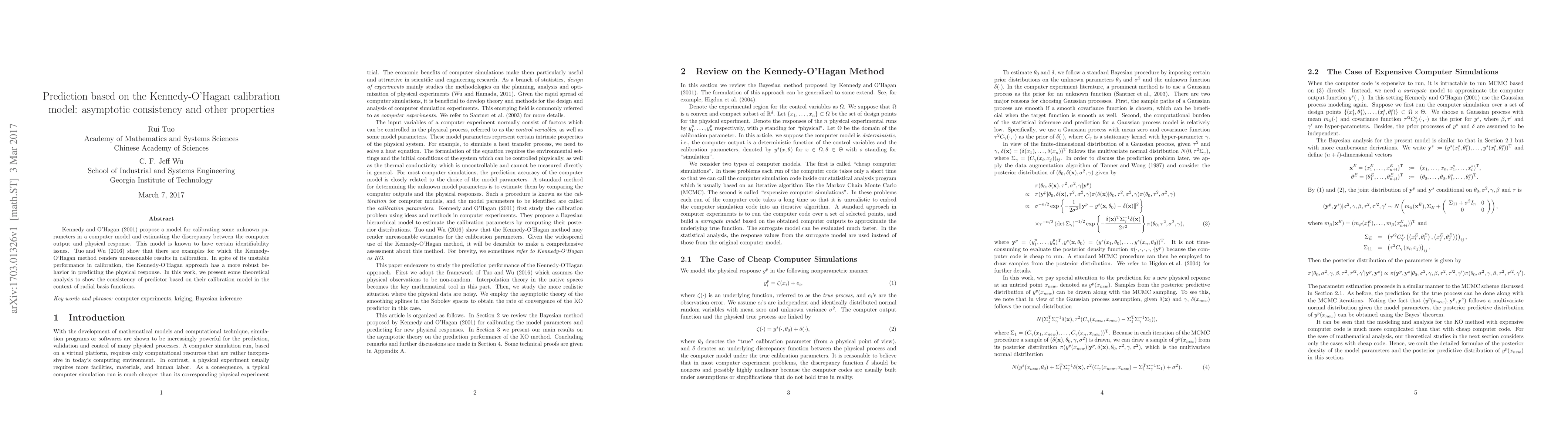 Kennedy and O'Hagan (2001) propose a model for calibrating some unknown parameters in a computer model and estimating the discrepancy between the computer output and physical response. This model is known to have certain identifiability issues. Tuo and Wu (2016) show that there are examples for which the Kennedy-O'Hagan method renders unreasonable results in calibration. In spite of its unstable performance in calibration, the Kennedy-O'Hagan approach has a more robust behavior in predicting the physical response. In this work, we present some theoretical analysis to show the consistency of predictor based on their calibration model in the context of radial basis functions.