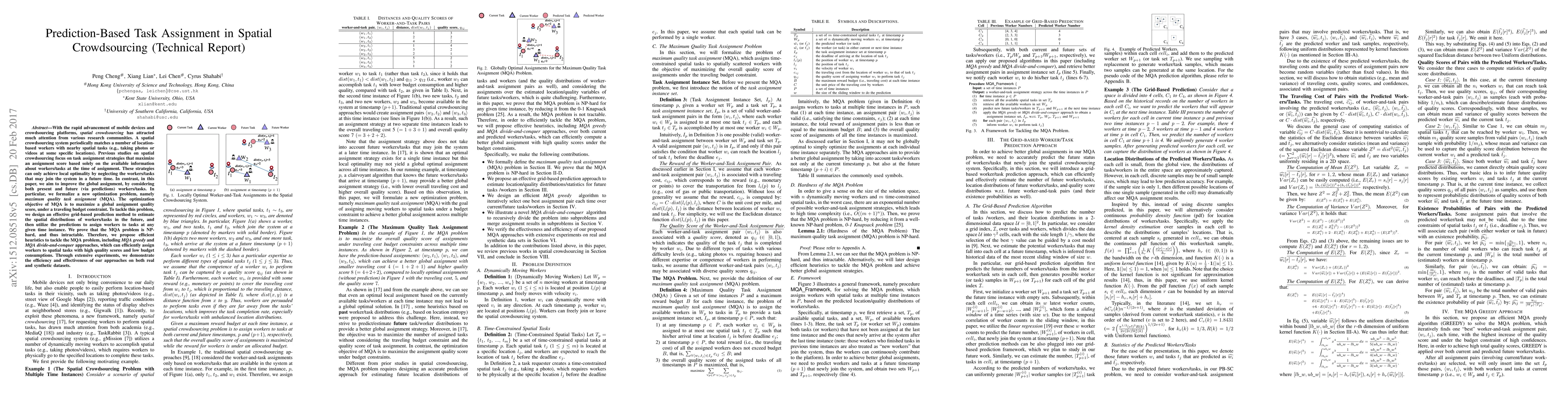This paper proposes a prediction-based approach for optimizing spatial crowdsourcing task assignments by considering both current and future workers/tasks. It introduces an NP-hard problem, PB-SC, and proposes efficient greedy and divide-and-conquer algorithms to achieve high-quality task assignments within budget constraints, validated through experiments on real/synthetic data.
