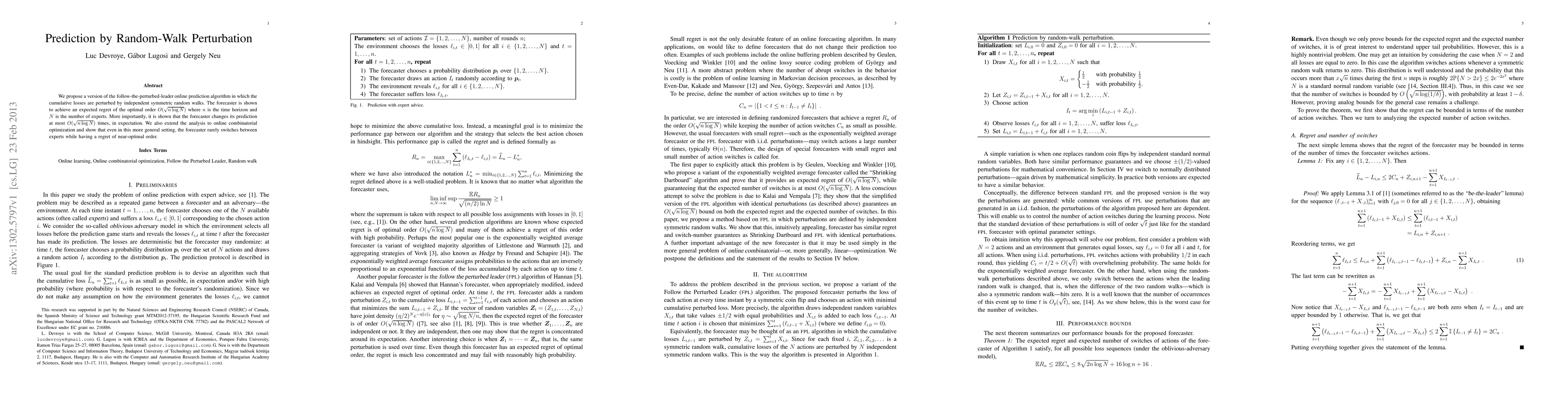 We propose a version of the follow-the-perturbed-leader online prediction algorithm in which the cumulative losses are perturbed by independent symmetric random walks. The forecaster is shown to achieve an expected regret of the optimal order O(sqrt(n log N)) where n is the time horizon and N is the number of experts. More importantly, it is shown that the forecaster changes its prediction at most O(sqrt(n log N)) times, in expectation. We also extend the analysis to online combinatorial optimization and show that even in this more general setting, the forecaster rarely switches between experts while having a regret of near-optimal order.