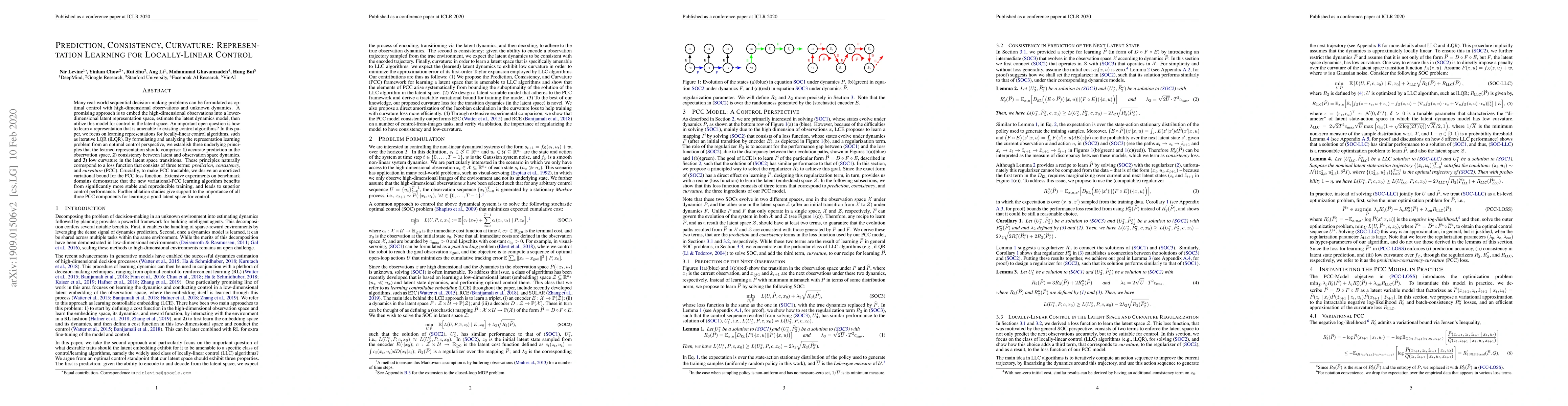 This paper proposes a method for learning latent representations that enhance locally-linear control algorithms, emphasizing prediction accuracy, consistency, and low curvature. An amortized variational bound is introduced to make the PCC loss function tractable, leading to stable and effective control performance in experiments.