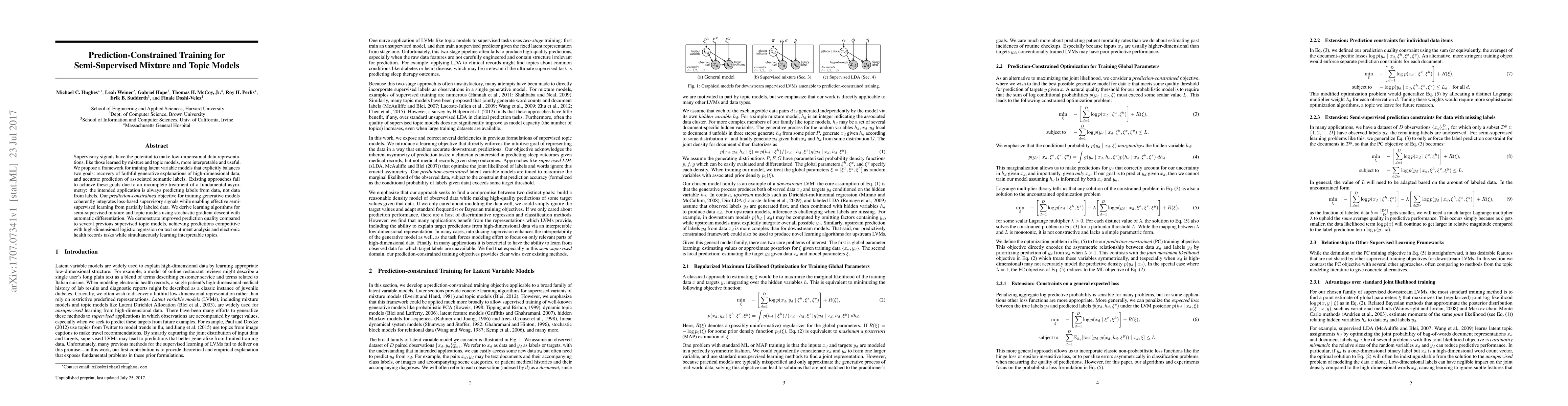 This paper proposes a framework for training semi-supervised mixture and topic models that integrates predictive and generative objectives, addressing the asymmetry in label prediction. The prediction-constrained training method achieves better label prediction and interpretable topic modeling compared to previous supervised models.