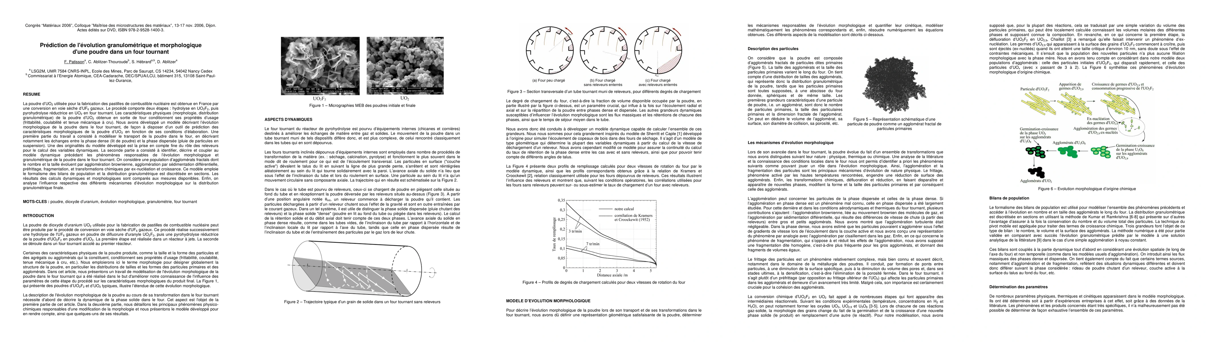 The dry conversion process for making UO2 nuclear fuel pellets consists of two steps: hydrolysis of UF6 to UO2F2, followed by reducing pyrohydrolysis to UO2 in a rotary kiln. The physical characteristics (morphology, particle size distribution) of the powder obtained at the kiln end determine the final properties (sinterability, flow-ability, green strength). We developed a mathematical model describing the morphological evolution of the powder in the rotary kiln, which enables us to predict morphological characteristics of UO2 powder as functions of the processing conditions. Firstly, the powder flow in the kiln was modelled, including the exchanges between a dense phase (powder bed) and an airborne phase (particles showering down). An original feature of this model is to consider the effect of lifters for calculating the dynamic variables. Secondly, the phenomena responsible for the changes in morphology and grain size were identified and modelled. A population of fractal agglomerates was considered, whose number and size change due to Brownian and sedimentation agglomeration, sintering, breaking up, and chemical reactions. The model is based on population balances and the particle size distribution is divided into sections. Results of both dynamic and morphological calculations are compared to available measurements. Lastly, the influence of the different mechanisms of morphological evolution on the final size distribution is analysed.