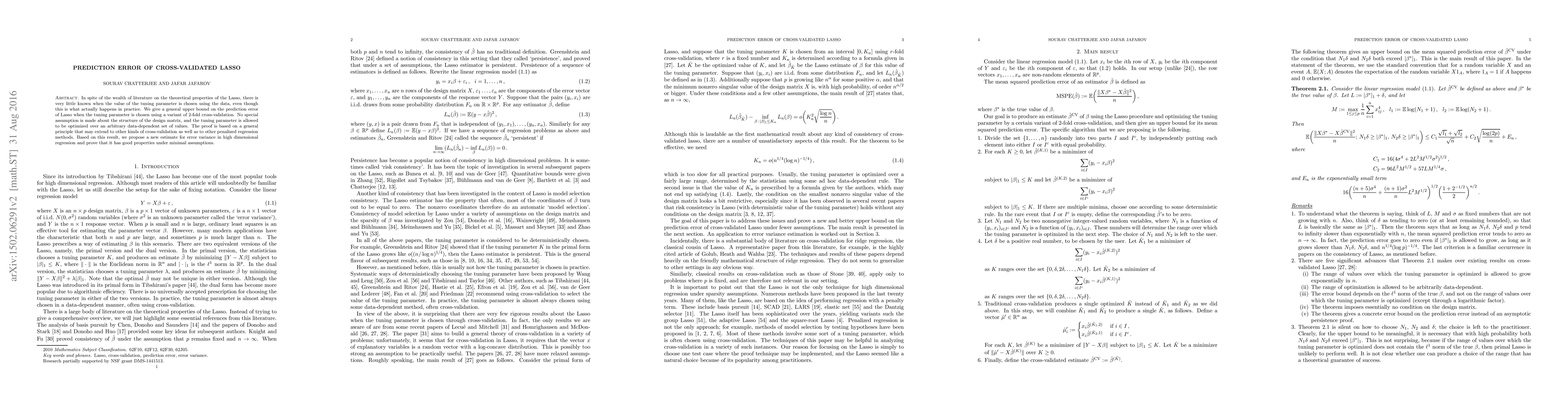 In spite of the wealth of literature on the theoretical properties of the Lasso, there is very little known when the value of the tuning parameter is chosen using the data, even though this is what actually happens in practice. We give a general upper bound on the prediction error of Lasso when the tuning parameter is chosen using a variant of 2-fold cross-validation. No special assumption is made about the structure of the design matrix, and the tuning parameter is allowed to be optimized over an arbitrary data-dependent set of values. The proof is based on a general principle that may extend to other kinds of cross-validation as well as to other penalized regression methods. Based on this result, we propose a new estimate for error variance in high dimensional regression and prove that it has good properties under minimal assumptions.