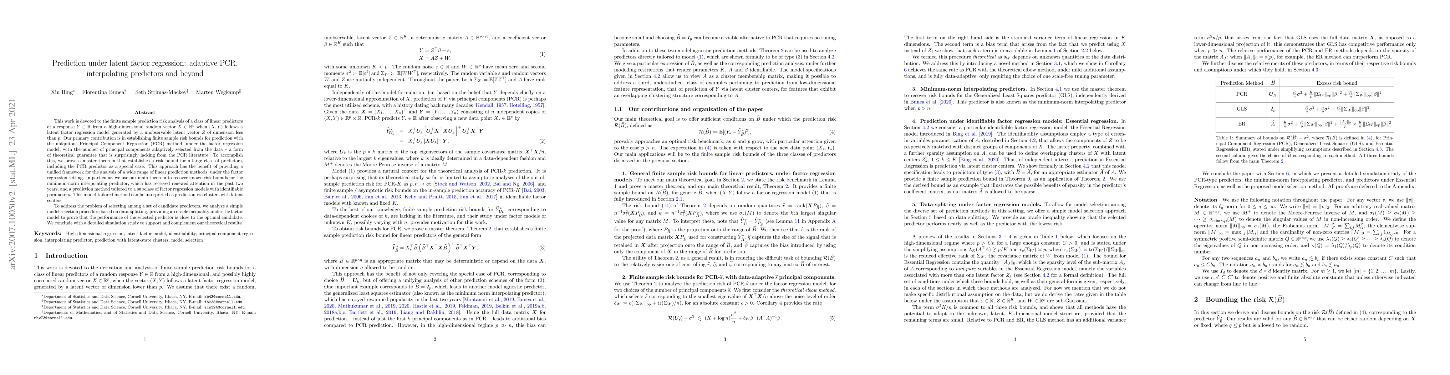 This work is devoted to the finite sample prediction risk analysis of a class of linear predictors of a response $Y\in \mathbb{R}$ from a high-dimensional random vector $X\in \mathbb{R}^p$ when $(X,Y)$ follows a latent factor regression model generated by a unobservable latent vector $Z$ of dimension less than $p$. Our primary contribution is in establishing finite sample risk bounds for prediction with the ubiquitous Principal Component Regression (PCR) method, under the factor regression model, with the number of principal components adaptively selected from the data -- a form of theoretical guarantee that is surprisingly lacking from the PCR literature. To accomplish this, we prove a master theorem that establishes a risk bound for a large class of predictors, including the PCR predictor as a special case. This approach has the benefit of providing a unified framework for the analysis of a wide range of linear prediction methods, under the factor regression setting. In particular, we use our main theorem to recover known risk bounds for the minimum-norm interpolating predictor, which has received renewed attention in the past two years, and a prediction method tailored to a subclass of factor regression models with identifiable parameters. This model-tailored method can be interpreted as prediction via clusters with latent centers. To address the problem of selecting among a set of candidate predictors, we analyze a simple model selection procedure based on data-splitting, providing an oracle inequality under the factor model to prove that the performance of the selected predictor is close to the optimal candidate. We conclude with a detailed simulation study to support and complement our theoretical results.