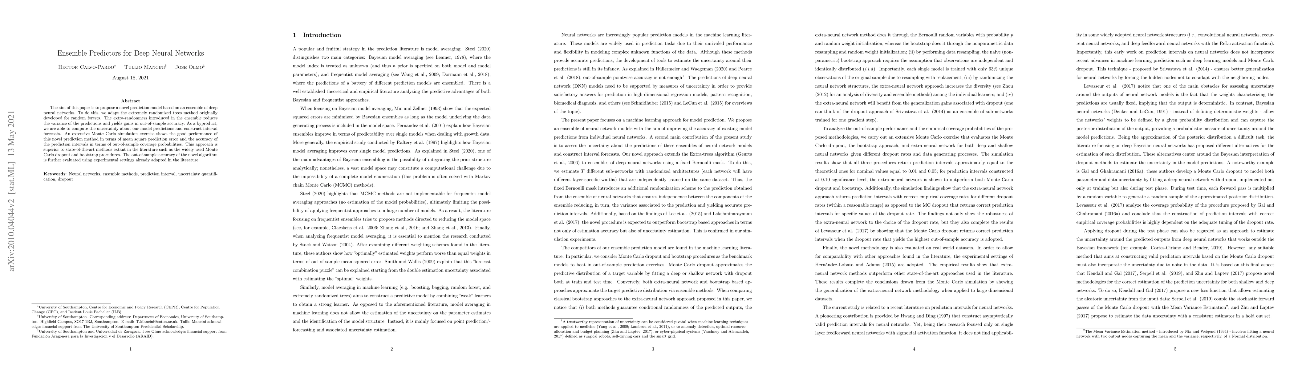 This paper proposes a method for constructing prediction intervals for deep neural networks by adapting the extremely randomized trees technique to create neural network ensembles, which improves out-of-sample accuracy and outperforms existing methods like MC dropout and bootstrapping, as demonstrated by Monte Carlo simulations and experimental evaluations.