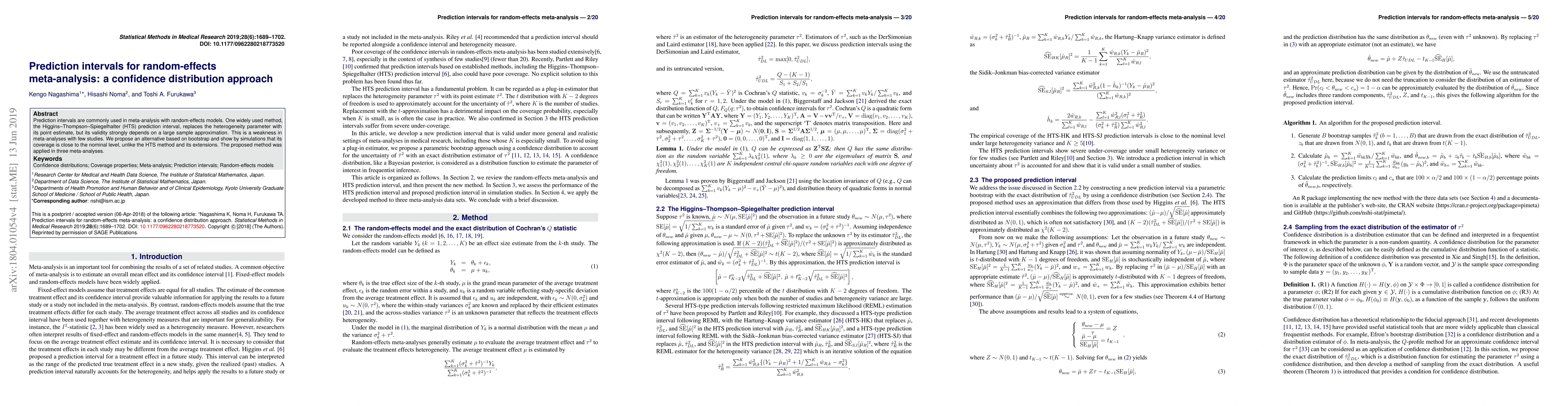 For the inference of random-effects models in meta-analysis, the prediction interval was proposed as a summary measure of the treatment effects that explains the heterogeneity in the target population. While the Higgins-Thompson-Spiegelhalter (HTS) plug-in-type prediction interval has been widely used, in which the heterogeneity parameter is replaced with its point estimate, its validity depends on a large sample approximation. Most meta-analyses, however, include less than 20 studies. It has been revealed that the validity of the HTS method is not assured under realistic situations, but no solution to this problem has been proposed in literature. Therefore, in this article, we describe our proposed prediction interval. Instead of using the plug-in scheme, we developed a bootstrap approach using an exact confidence distribution to account for the uncertainty in estimation of the heterogeneity parameter. Compared to the HTS method, the proposed method provides an accurate prediction interval that adequately explains the heterogeneity of treatment effects and the statistical error. Simulation studies demonstrated that the HTS method had poor coverage performance; by contrast, the coverage probabilities for the proposed method satisfactorily retained the nominal level. Applications to three published random-effects meta-analyses are presented.