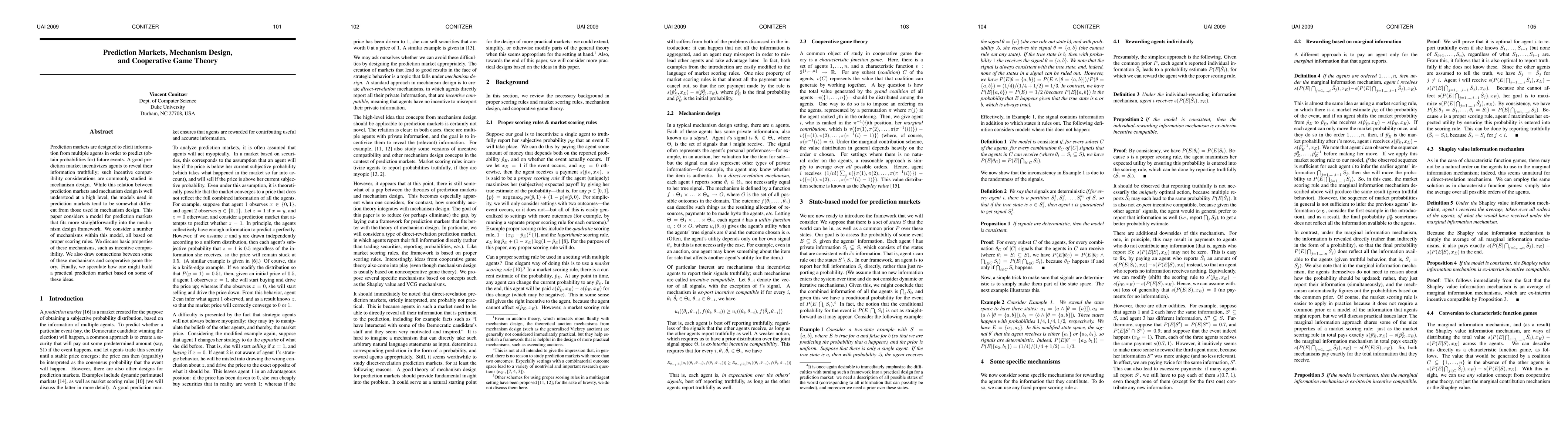 This paper explores prediction markets within the mechanism design framework, proposing mechanisms based on proper scoring rules that ensure incentive compatibility. It also draws connections between these mechanisms and cooperative game theory, and discusses practical implications for building effective prediction markets.