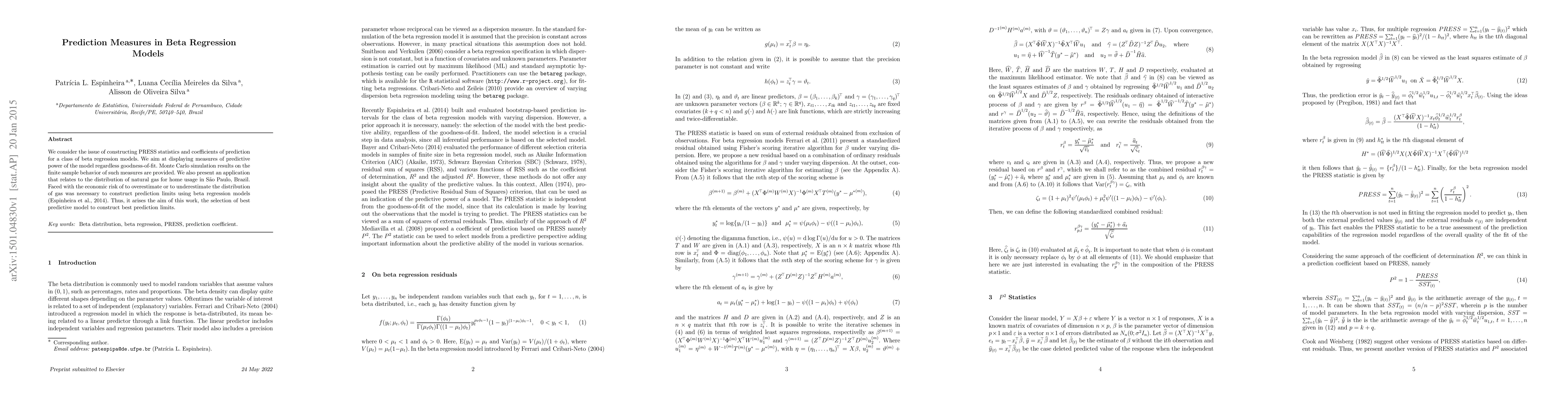 We consider the issue of constructing PRESS statistics and coefficients of prediction for a class of beta regression models. We aim at displaying measures of predictive power of the model regardless goodness-of-fit. Monte Carlo simulation results on the finite sample behavior of such measures are provided.We also present an application that relates to the distribution of natural gas for home usage in S\~ao Paulo, Brazil. Faced with the economic risk of to overestimate or to underestimate the distribution of gas was necessary to construct prediction limits using beta regression models (Espinheira et al., 2014). Thus, it arises the aim of this work, the selection of best predictive model to construct best prediction limits.