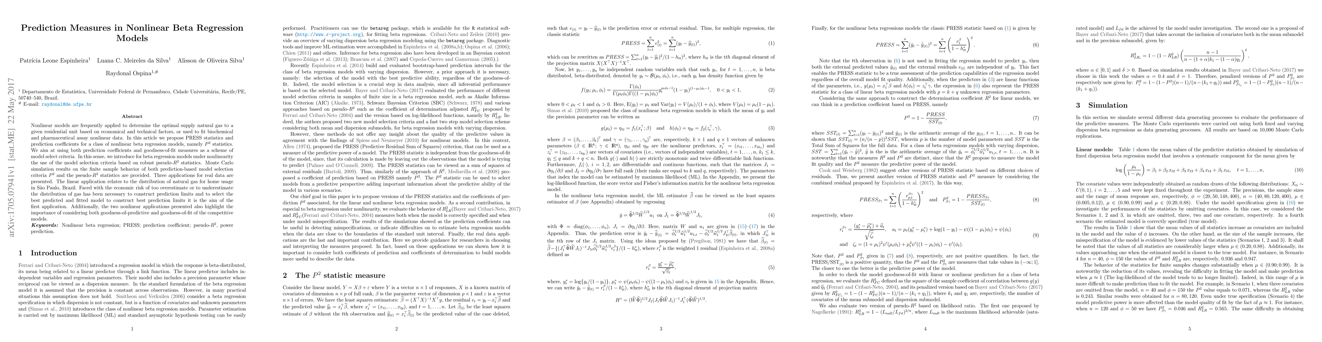 Nonlinear models are frequently applied to determine the optimal supply natural gas to a given residential unit based on economical and technical factors, or used to fit biochemical and pharmaceutical assay nonlinear data. In this article we propose PRESS statistics and prediction coefficients for a class of nonlinear beta regression models, namely $P^2$ statistics. We aim at using both prediction coefficients and goodness-of-fit measures as a scheme of model select criteria. In this sense, we introduce for beta regression models under nonlinearity the use of the model selection criteria based on robust pseudo-$R^2$ statistics. Monte Carlo simulation results on the finite sample behavior of both prediction-based model selection criteria $P^2$ and the pseudo-$R^2$ statistics are provided. Three applications for real data are presented. The linear application relates to the distribution of natural gas for home usage in S\~ao Paulo, Brazil. Faced with the economic risk of too overestimate or to underestimate the distribution of gas has been necessary to construct prediction limits and to select the best predicted and fitted model to construct best prediction limits it is the aim of the first application. Additionally, the two nonlinear applications presented also highlight the importance of considering both goodness-of-predictive and goodness-of-fit of the competitive models.