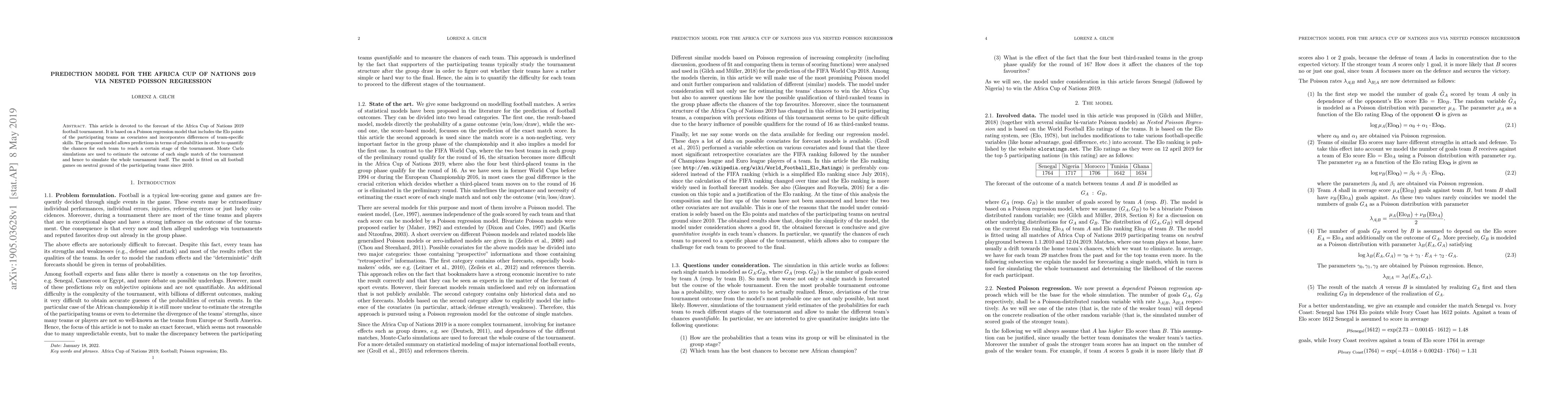 This article is devoted to the forecast of the Africa Cup of Nations 2019 football tournament. It is based on a Poisson regression model that includes the Elo points of the participating teams as covariates and incorporates differences of team-specific skills. The proposed model allows predictions in terms of probabilities in order to quantify the chances for each team to reach a certain stage of the tournament. Monte Carlo simulations are used to estimate the outcome of each single match of the tournament and hence to simulate the whole tournament itself. The model is fitted on all football games on neutral ground of the participating teams since 2010.