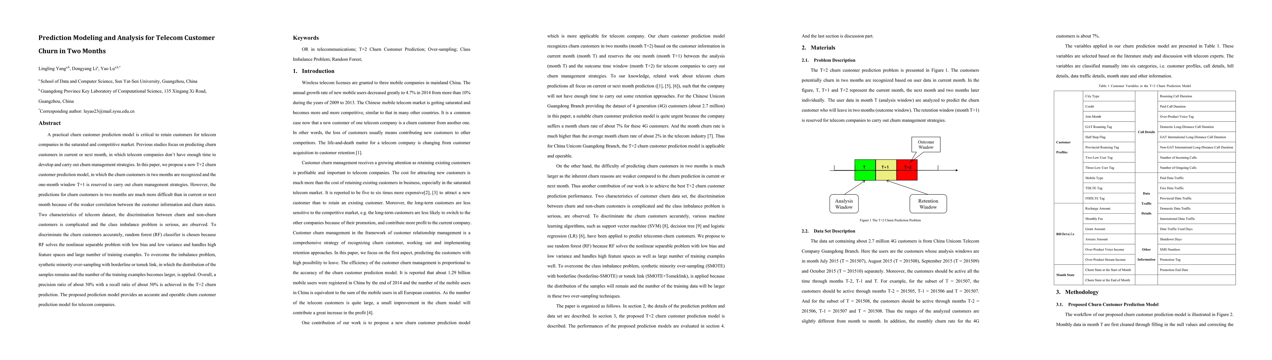 The paper presents a novel T+2 churn prediction model using Random Forest, borderline-SMOTE, and SMOTE+TomekLink to address class imbalance, providing improved prediction performance compared to traditional methods.