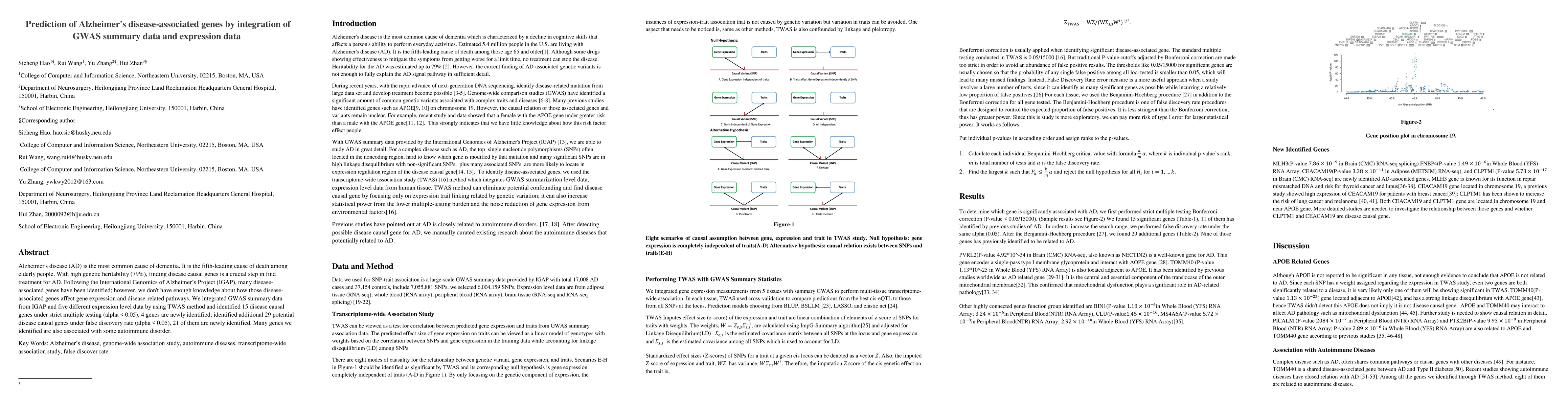 This study integrates GWAS summary data from the IGAP and expression data to identify Alzheimer's disease-associated genes using the TWAS method, revealing 15 causal genes, 4 of which are newly identified, and 29 potential causal genes, 21 of which are also newly identified. Many of these genes are linked to autoimmune disorders.
