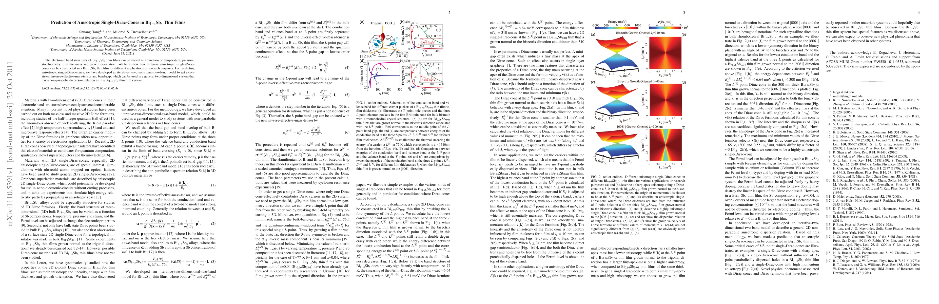 This paper presents an iterative-two-dimensional-two-band model to predict anisotropic single-Dirac-cones in Bi${}_{1-x}$Sb${}_{x}$ thin films, enabling varied electronic band structures based on factors like temperature and pressure. The model provides a consistent inverse-effective-mass-tensor and band-gap for non-parabolic dispersion relations.