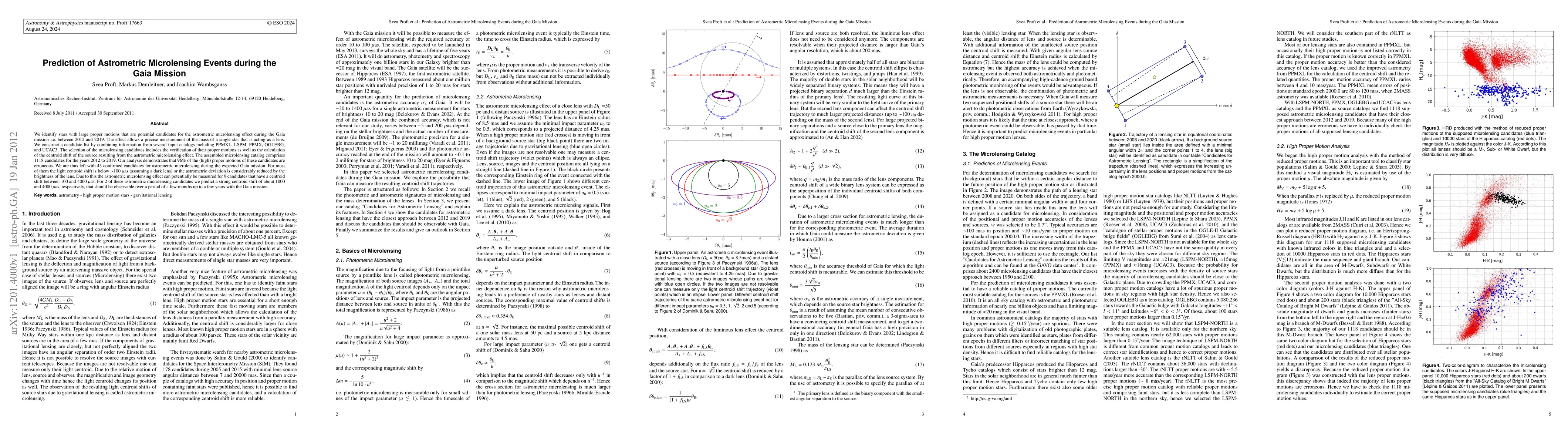 This paper identifies potential astrometric microlensing events during the Gaia mission (2012-2019) by analyzing stars with large proper motions. The study compiles a list of 1118 candidates from various catalogs, but only 43 are confirmed, with 9 having measurable centroid shifts, including 2 with strong shifts of 1000 and 4000 microarcsec.