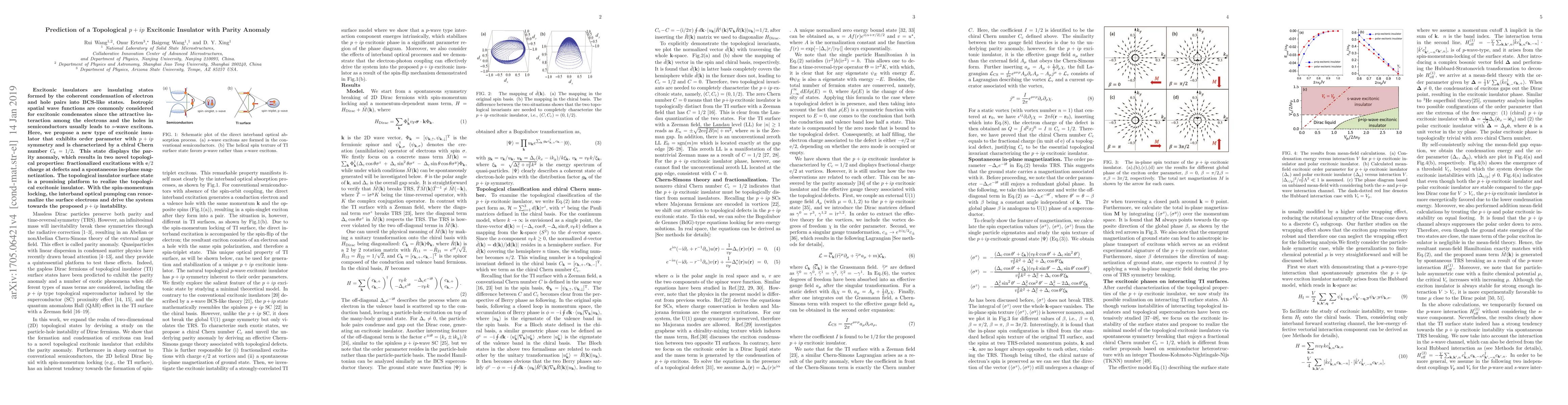 This paper proposes a novel $p+ip$ excitonic insulator characterized by a chiral Chern number and a parity anomaly, leading to fractionalized excitations and spontaneous in-plane magnetization. The topological insulator surface state is identified as a potential platform to realize this new topological phase.