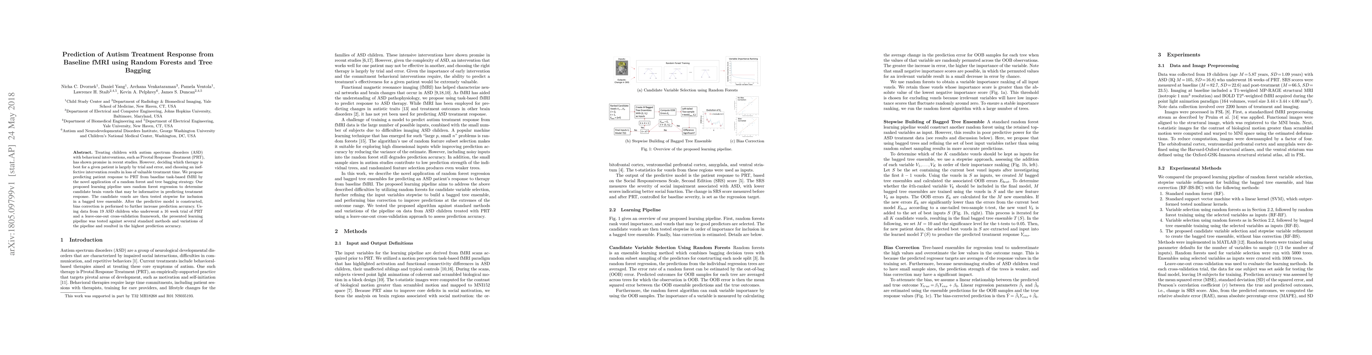 This study proposes a predictive model using baseline fMRI data and a combination of random forest and tree bagging to forecast treatment response to Pivotal Response Treatment in children with autism spectrum disorders. The model achieved higher prediction accuracy compared to standard methods, suggesting potential for personalized therapy selection.