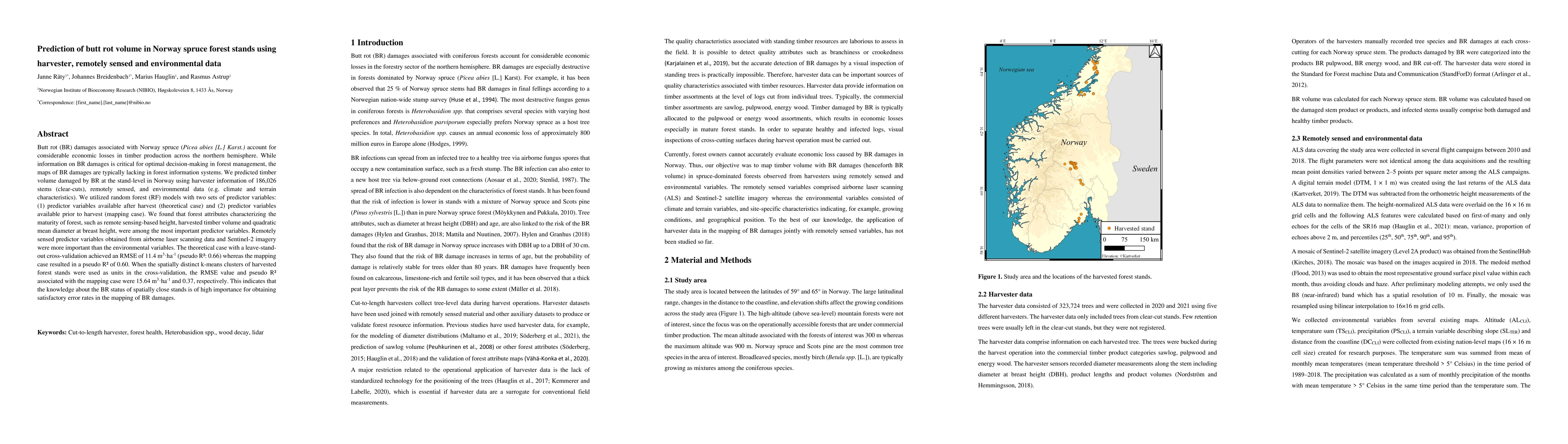 Researchers in Norway used data from harvester records, remote sensing, and environmental factors to predict the volume of butt rot damage in spruce forests, achieving moderate accuracy. The study highlights the importance of considering spatial proximity when predicting BR damages for more accurate results.