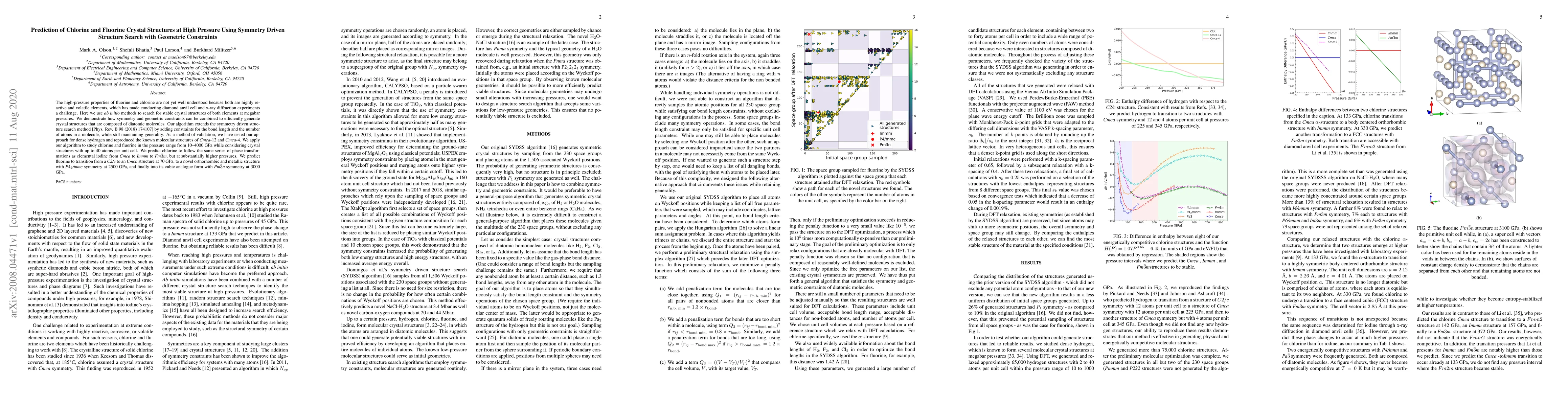 The high-pressure properties of fluorine and chlorine are not yet well understood because both are highly reactive and volatile elements, which has made conducting diamond anvil cell and x-ray diffraction experiments a challenge. Here we use ab initio methods to search for stable crystal structures of both elements at megabar pressures. We demonstrate how symmetry and geometric constraints can be combined to efficiently generate crystal structures that are composed of diatomic molecules. Our algorithm extends the symmetry driven structure search method [Phys. Rev. B 98 (2018) 174107] by adding constraints for the bond length and the number of atoms in a molecule, while still maintaining generality. As a method of validation, we have tested our approach for dense hydrogen and reproduced the known molecular structures of Cmca-12 and Cmca-4. We apply our algorithm to study chlorine and fluorine in the pressure range from 10--4000 GPa while considering crystal structures with up to 40 atoms per unit cell. We predict chlorine to follow the same series of phase transformations as elemental iodine from Cmca to Immm to Fm$\bar{3}$m, but at substantially higher pressures. We predict fluorine to transition from a C2/c to an Cmca structure at 70 GPa, to a novel orthorhombic and metallic structure with P$4_2$/mmc symmetry at 2500 GPa, and finally into its cubic analogue form with Pm$\bar{3}$n symmetry at 3000 GPa.