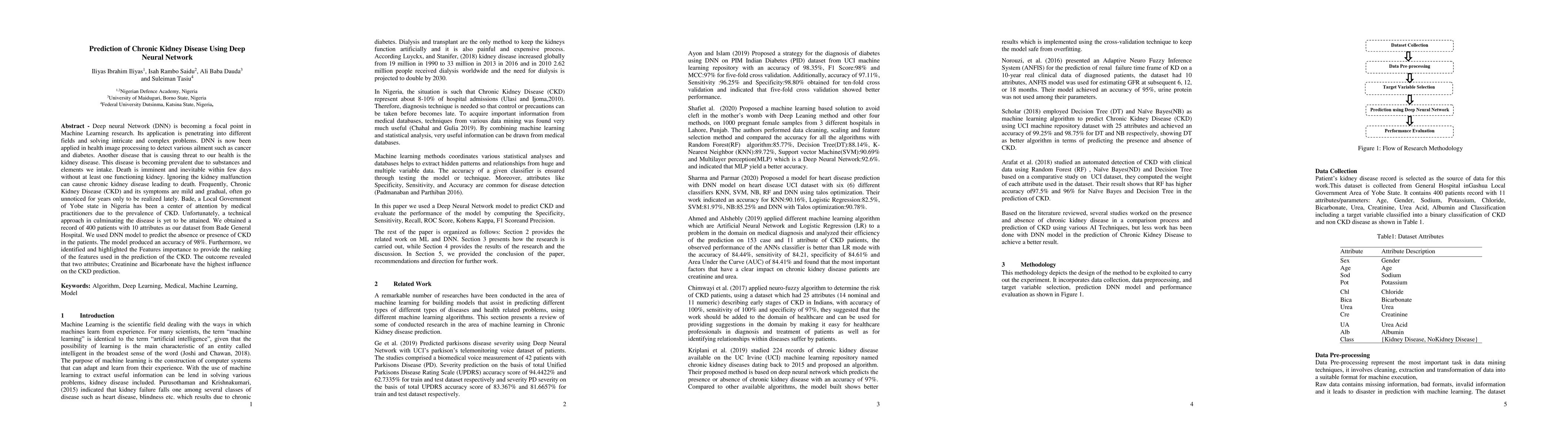 This research applies a Deep Neural Network (DNN) to predict Chronic Kidney Disease (CKD) using a dataset from Bade General Hospital in Nigeria, achieving 98% accuracy. The study highlights Creatinine and Bicarbonate as the most influential features for CKD prediction.