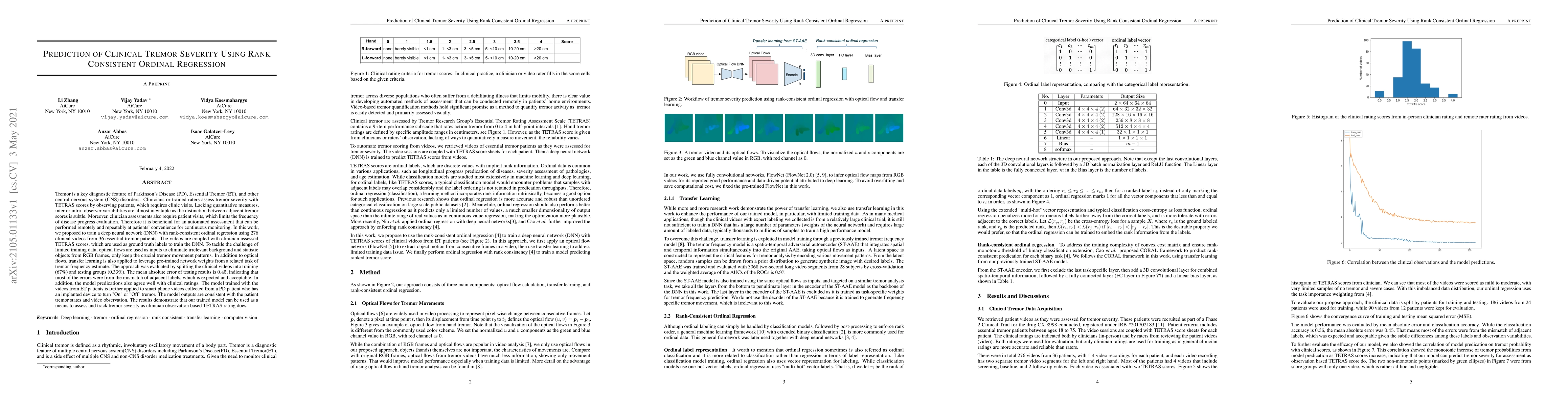 This paper proposes a deep neural network with rank-consistent ordinal regression to predict clinical tremor severity using 276 videos from 36 essential tremor patients. The model, trained with optical flows and transfer learning, achieves a mean absolute error of 0.45 on TETRAS scores, demonstrating its potential to provide a remote, repeatable, and continuous tremor assessment tool.
