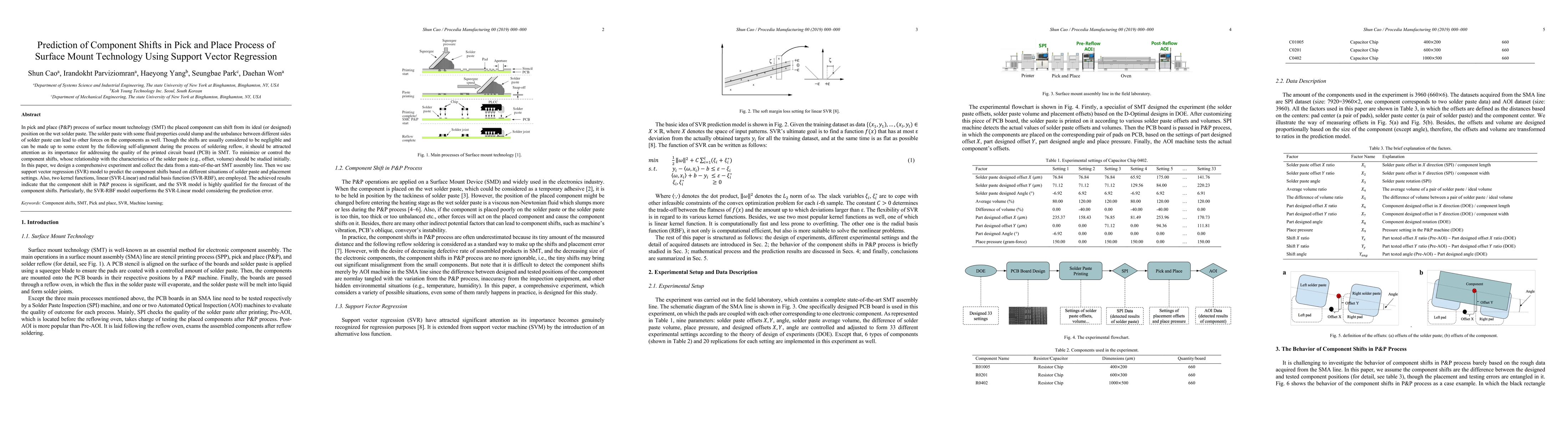 This research uses Support Vector Regression (SVR) to predict component shifts in Surface Mount Technology's pick and place process. The study finds that component shifts are significant and SVR models, especially SVR-RBF, effectively predict these shifts, aiding in minimizing component misplacement issues in PCB quality.