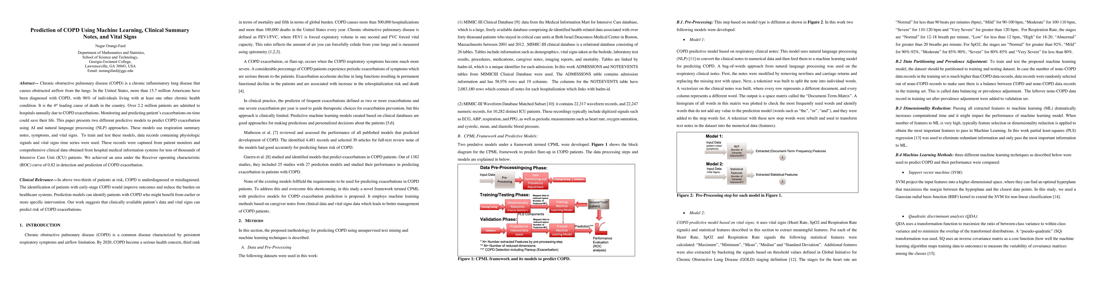 This paper develops two predictive models using machine learning and NLP to forecast COPD exacerbations by analyzing clinical summary notes, symptoms, and vital signs. It achieved an ROC curve area of 0.82 in predicting COPD exacerbations in ICU patients.