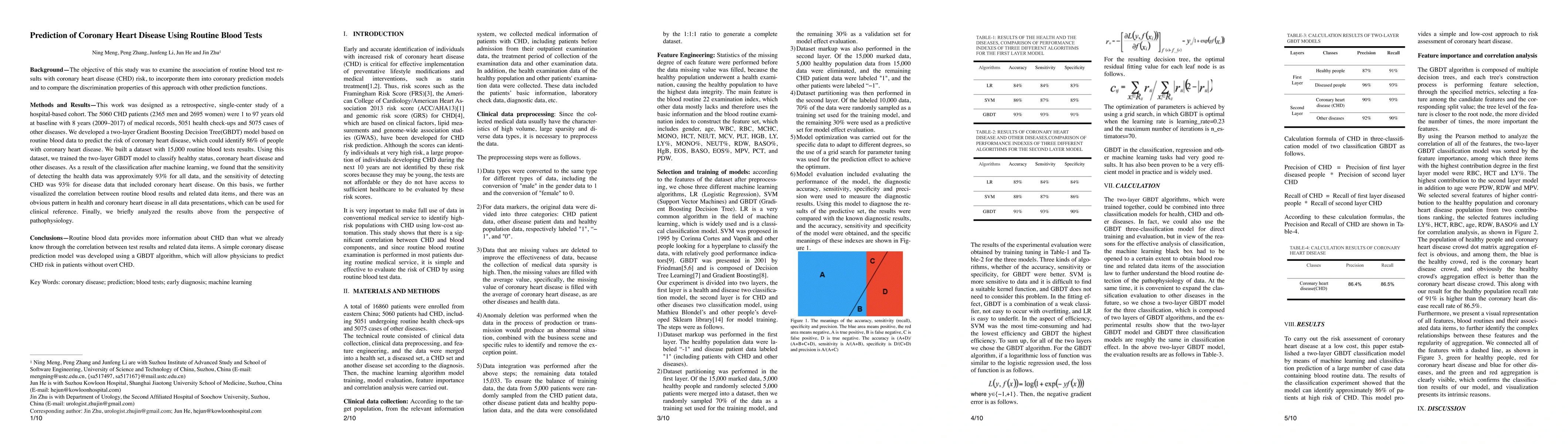 This study developed a two-layer Gradient Boosting Decision Tree model using routine blood test results to predict coronary heart disease (CHD) risk, achieving 86% identification of CHD patients and 93% sensitivity. The model provides valuable insights into the correlation between routine blood data and CHD, offering a new tool for CHD risk prediction.