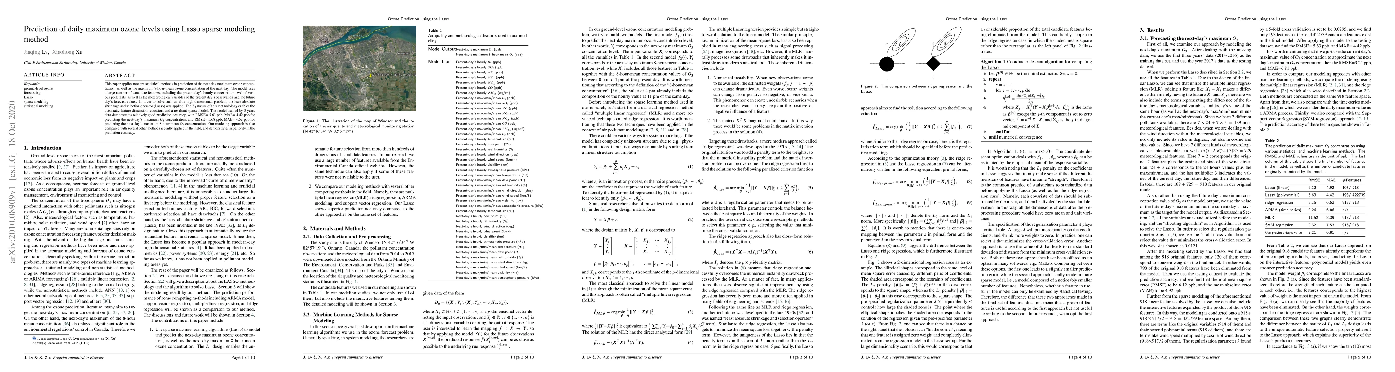 This research employs Lasso sparse modeling to predict daily maximum ozone levels, utilizing a variety of pollutant and meteorological data. The model, trained on 3 years of data, shows good accuracy with RMSE and MAE values of 5.63 ppb and 4.42 ppb for next-day max O3, outperforming other methods in the field.