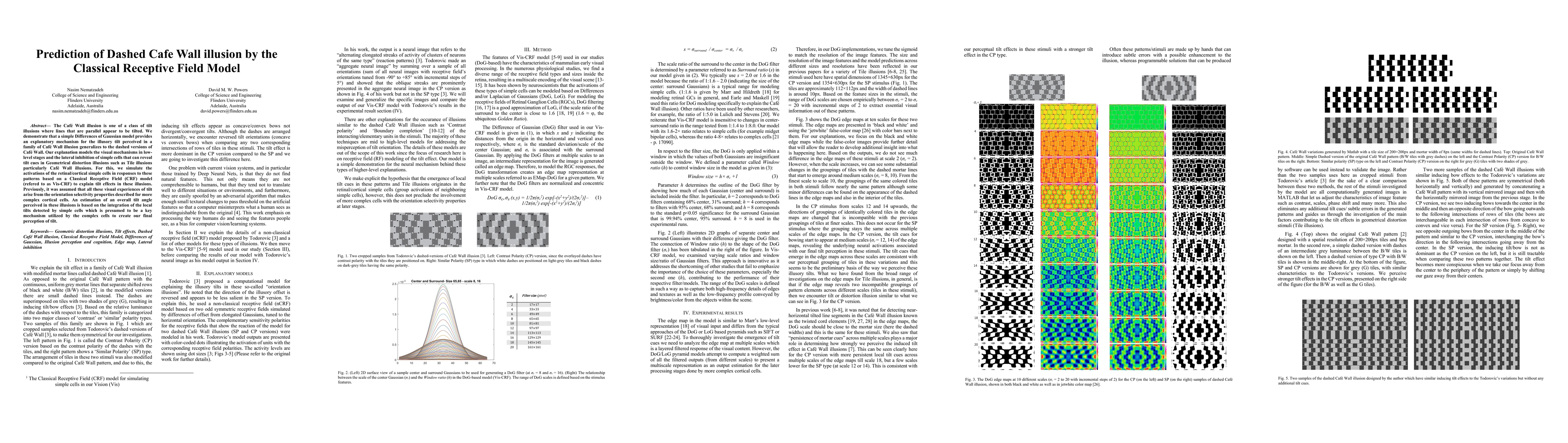 The paper demonstrates that a Differences of Gaussian model, based on a Classical Receptive Field (CRF) model, can predict the illusory tilt in dashed versions of the Café Wall illusion. It suggests that simple cells' activations and lateral inhibition mechanisms in low-level visual processing are key to perceiving tilt in such geometrical distortion illusions.