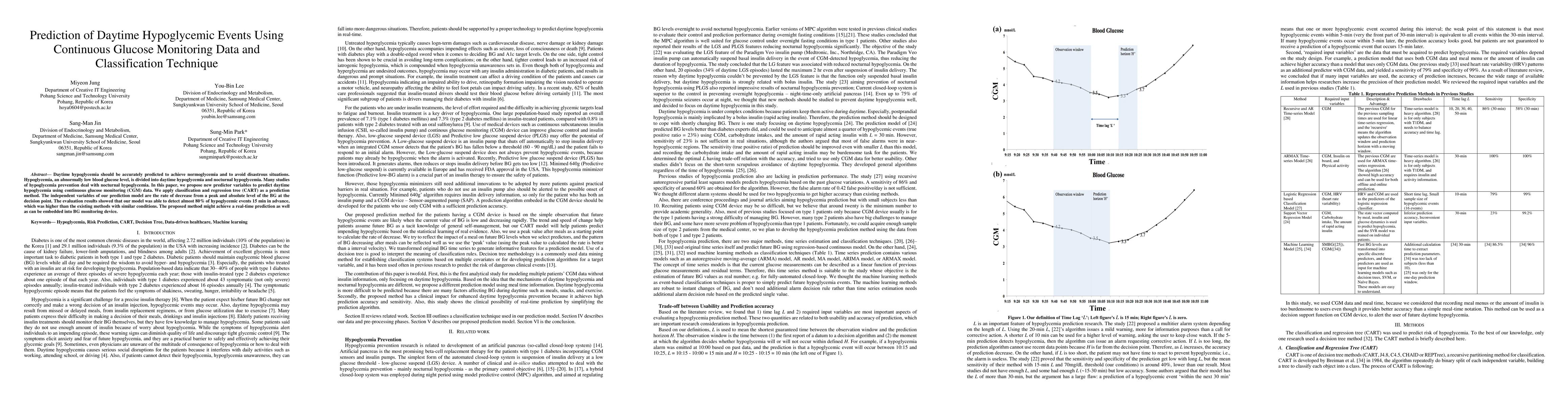 This paper proposes a new method to predict daytime hypoglycemia using continuous glucose monitoring data and classification and regression tree (CART) technique. The model uses rate of decrease from a peak and absolute blood glucose level as predictor variables, achieving nearly 80% detection rate 15 minutes in advance, outperforming existing methods.