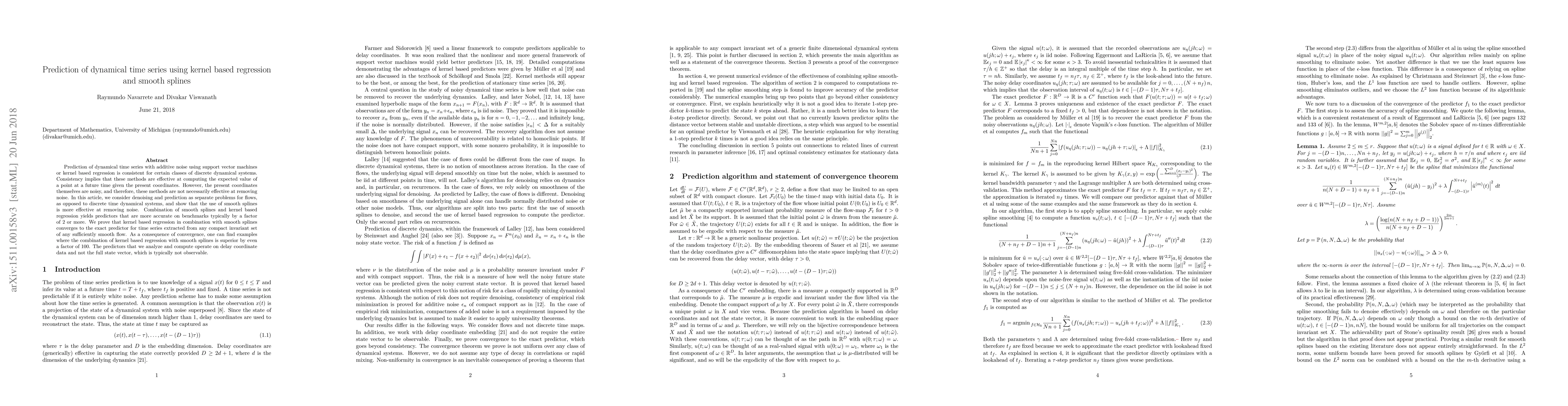 This paper proposes a method combining kernel-based regression and smooth splines for predicting and denoising dynamical time series, showing superior accuracy over existing methods by a factor of 2 or more. The approach leverages delay coordinate data, proving convergence to the exact predictor for smooth flows.