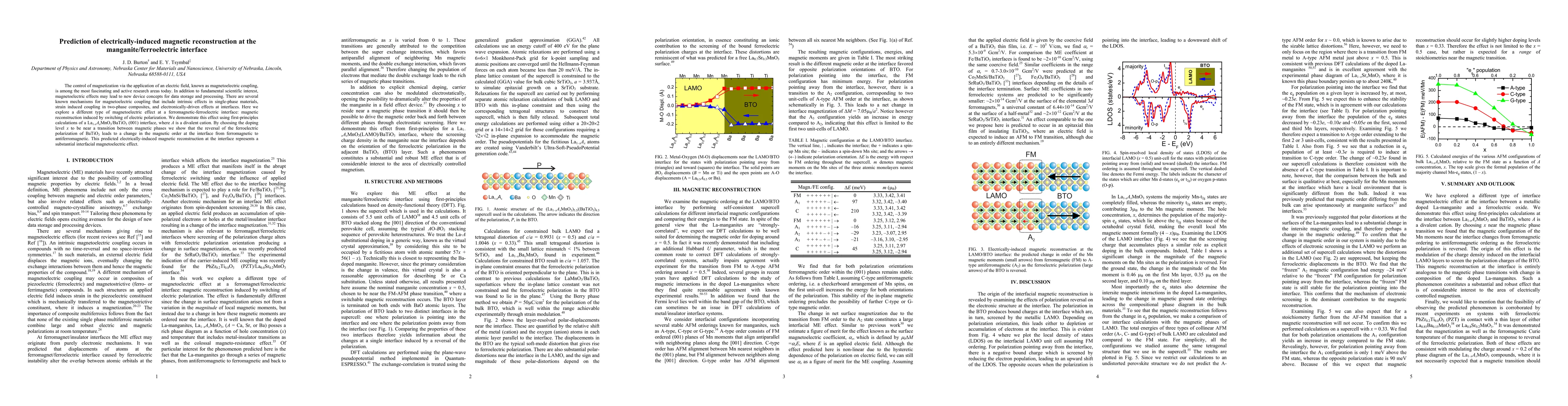 This paper investigates magnetoelectric coupling at a La1-xAxMnO3/BaTiO3 interface, demonstrating that reversing the ferroelectric polarization of BaTiO3 induces a magnetic reconstruction from ferromagnetic to antiferromagnetic. This electrically-induced magnetic change represents a significant interfacial magnetoelectric effect.