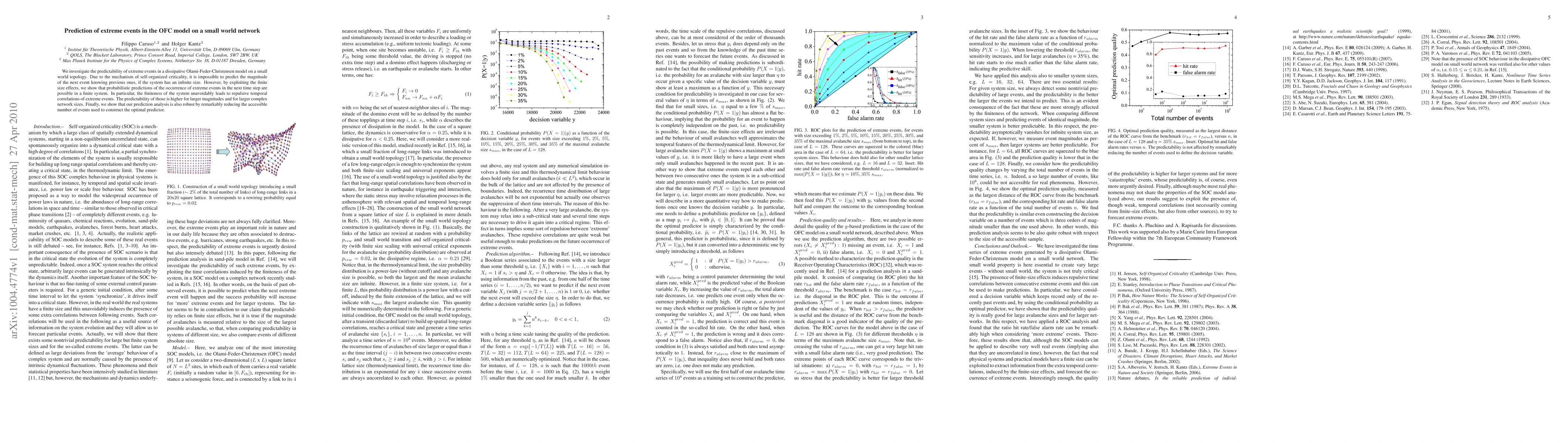 This paper explores the predictability of extreme events in a dissipative OFC model on a small world network, demonstrating that finite size effects allow for probabilistic predictions of extreme events, especially for larger magnitudes and network sizes. The study also shows that the predictability is robust even with a reduced number of events used for prediction.