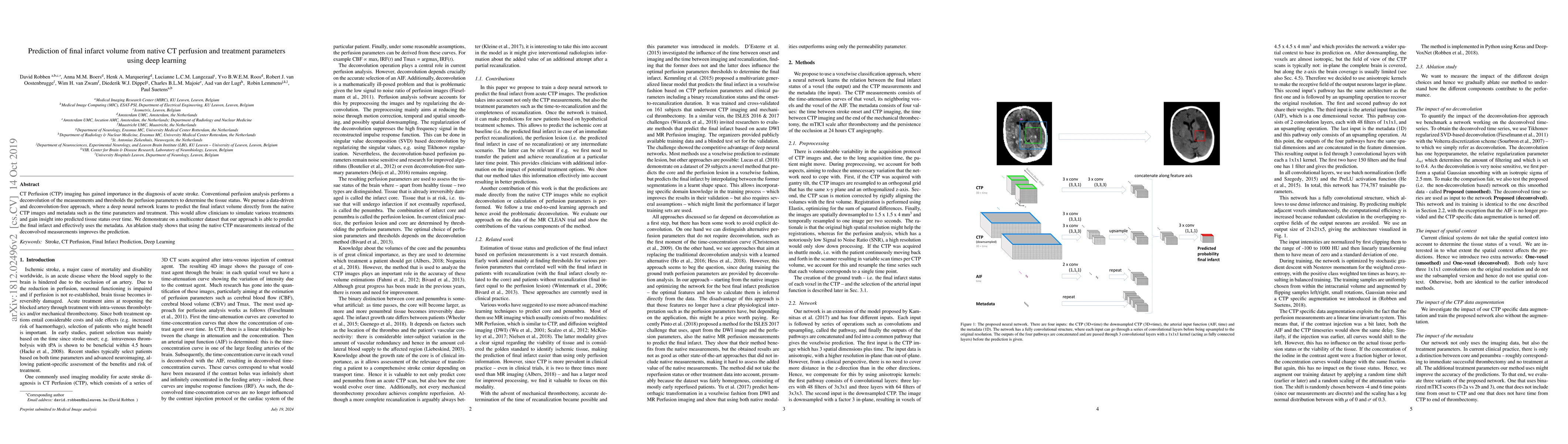 CT Perfusion (CTP) imaging has gained importance in the diagnosis of acute stroke. Conventional perfusion analysis performs a deconvolution of the measurements and thresholds the perfusion parameters to determine the tissue status. We pursue a data-driven and deconvolution-free approach, where a deep neural network learns to predict the final infarct volume directly from the native CTP images and metadata such as the time parameters and treatment. This would allow clinicians to simulate various treatments and gain insight into predicted tissue status over time. We demonstrate on a multicenter dataset that our approach is able to predict the final infarct and effectively uses the metadata. An ablation study shows that using the native CTP measurements instead of the deconvolved measurements improves the prediction.
