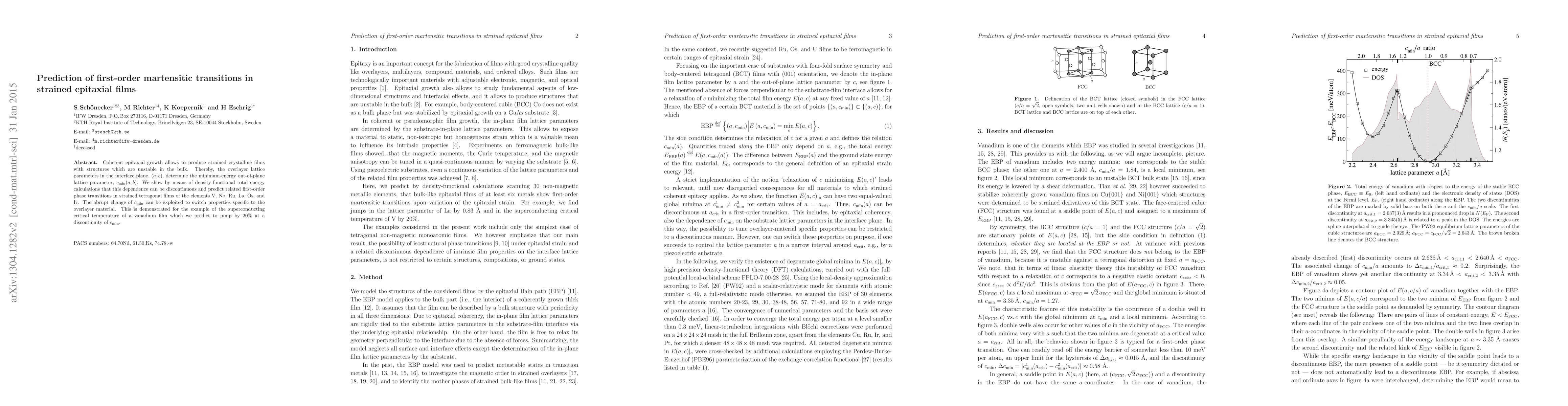 This paper investigates the prediction of first-order martensitic transitions in strained epitaxial films, demonstrating that discontinuities in lattice parameters can lead to abrupt changes in intrinsic properties, such as the superconducting critical temperature of a V film, which jumps by 20% at a specific $c_{\text{min}}$ discontinuity.