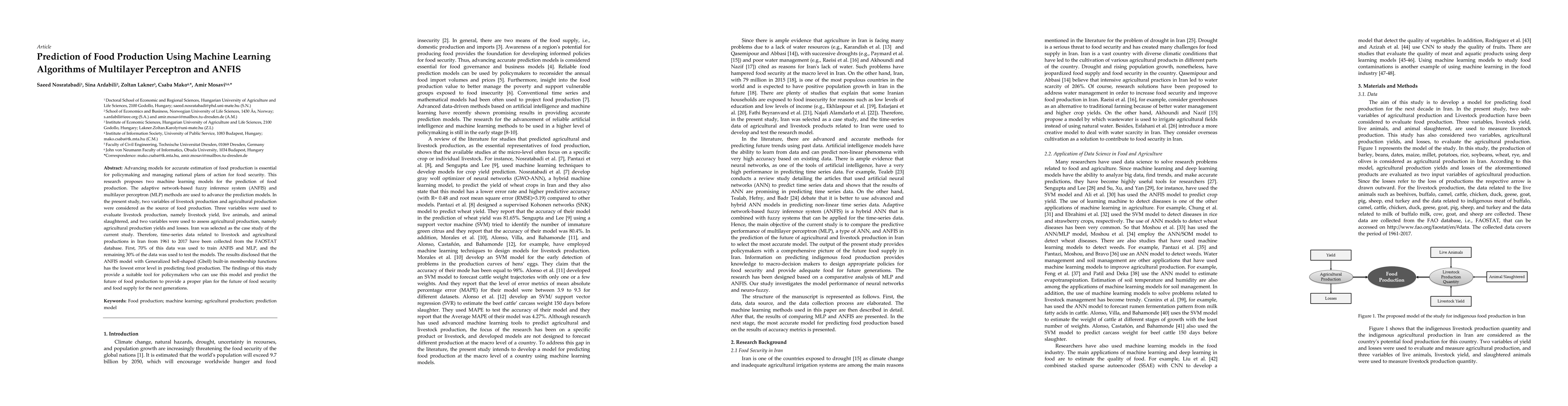 This research develops two machine learning models—ANFIS and MLP—to predict food production in Iran, using livestock and agricultural production data from 1961 to 2017. The ANFIS model with Generalized bell-shaped membership functions showed the lowest prediction error, offering valuable insights for future food security planning.