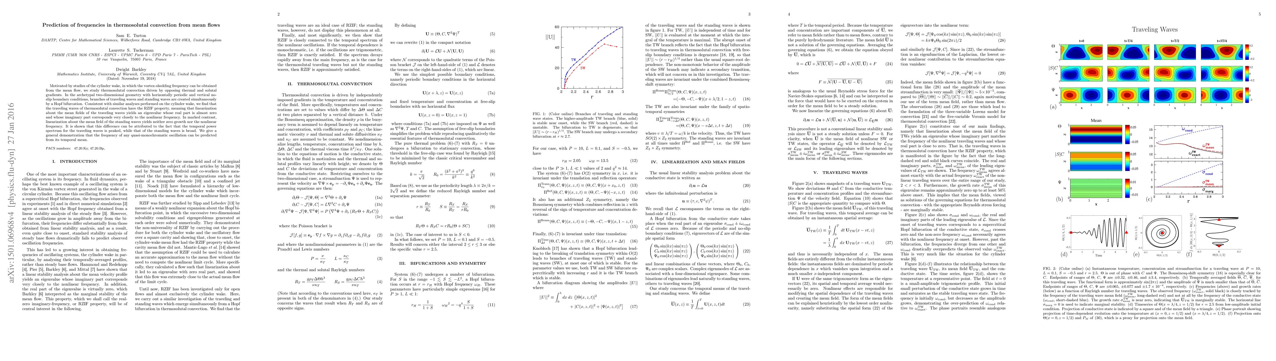 Motivated by studies of the cylinder wake, in which the vortex-shedding frequency can be obtained from the mean flow, we study thermosolutal convection driven by opposing thermal and solutal gradients. In the archetypal two-dimensional geometry with horizontally periodic and vertical no-slip boundary conditions, branches of traveling waves and standing waves are created simultaneously by a Hopf bifurcation. Consistent with similar analyses performed on the cylinder wake, we find that the traveling waves of thermosolutal convection have the RZIF property, meaning that linearization about the mean fields of the traveling waves yields an eigenvalue whose real part is almost zero and whose imaginary part corresponds very closely to the nonlinear frequency. In marked contrast, linearization about the mean field of the standing waves yields neither zero growth nor the nonlinear frequency. It is shown that this difference can be attributed to the fact that the temporal power spectrum for the traveling waves is peaked, while that of the standing waves is broad. We give a general demonstration that the frequency of any quasi-monochromatic oscillation can be predicted from its temporal mean.