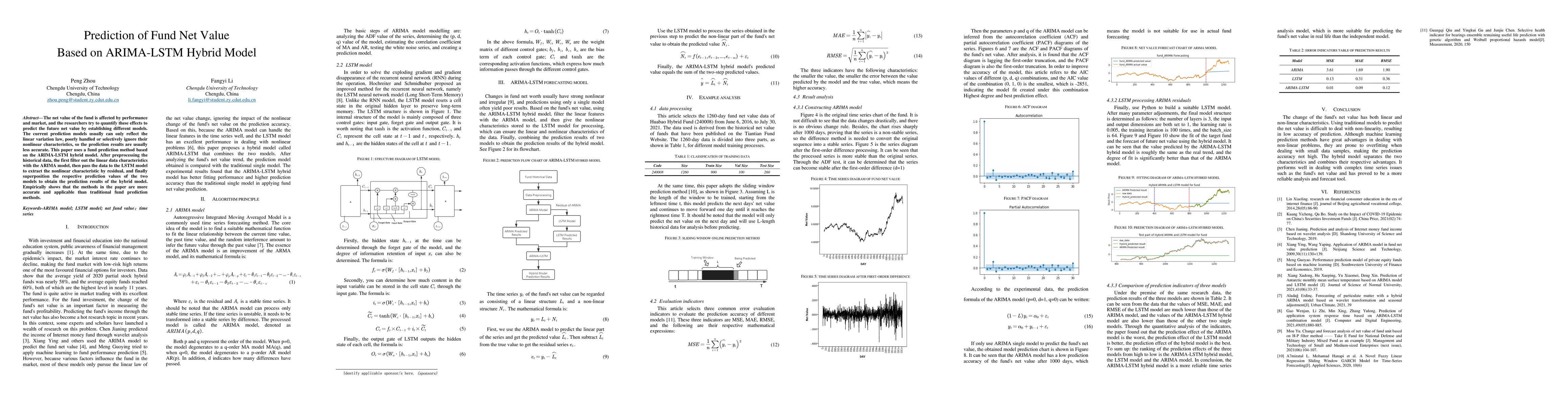 This paper proposes a fund prediction method using an ARIMA-LSTM hybrid model, which combines linear and nonlinear characteristics for more accurate predictions. The results show that the hybrid model outperforms traditional methods in accuracy and applicability.