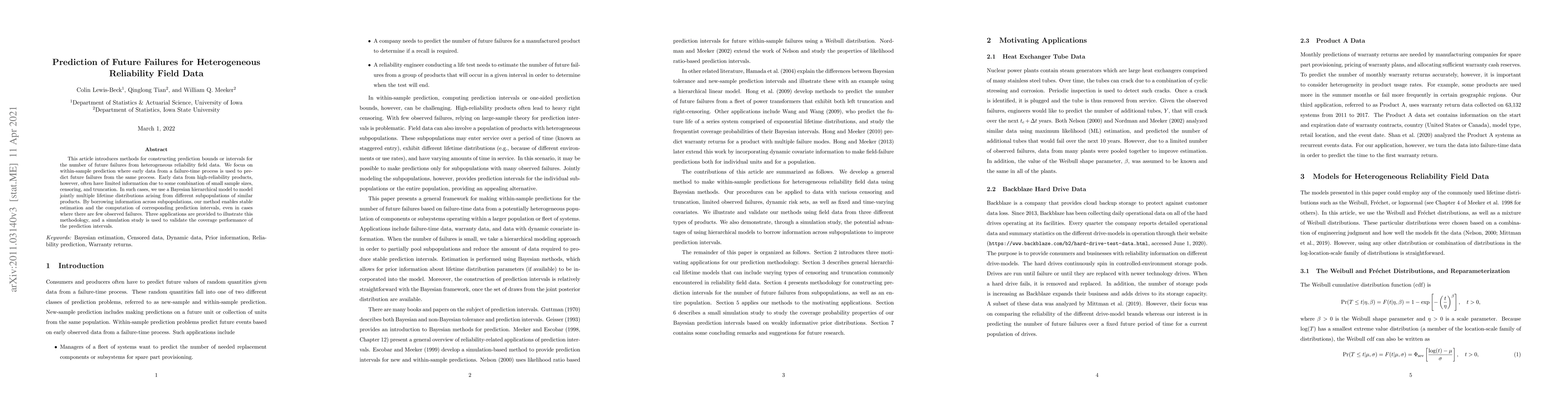 This paper develops Bayesian hierarchical models to predict future failures from heterogeneous reliability field data, addressing challenges like small sample sizes and censoring. The method borrows information across subpopulations to provide stable predictions and prediction intervals, validated through applications and simulations.